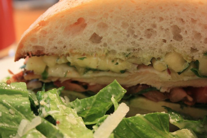 This beautiful thang is called the chicken and avocado club. Moist, tender grilled chicken topped with a generous portion of chopped avocados, plum tomatoes, baby spinach and melted provole. There was even a little pineapple salsa and a very thin layer of cilantro mayo. Served on a wonderfully fresh, thick bolo roll and served with a light caesar salad. Now that’s a sandwich!