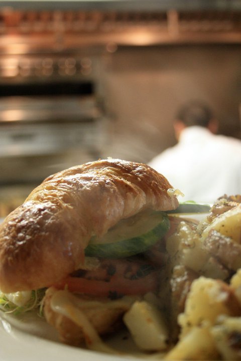 This was a vegetarian croissant sandwich (vegetarian only because it contained no bacon, which I wasn’t really in the mood for anyway). Flaky, buttery and delicious halved croissant, grilled. In between, muenster cheese melting over an over-easy egg, slightly wilted baby spinach, sauteed mushrooms, tomato slices, fresh and crispy cucumber rounds and a bush of alfalfa sprouts. Served with herbed, roasted “house” potatoes.