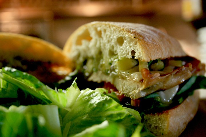 My favorite. The beef tenderloin sandwich. Two beautifully juicy slices of roast beef tenderloin topped with a tart watercress and apple relish (little chunks of both mixed in with a horseradish aioli). Saint andre cheese melting in between the two layers. Served on a bolo roll with a salad of romaine, grape tomatoes, radishes, toasted sunflower seeds and a slightly peppery lemon vinaigrette.