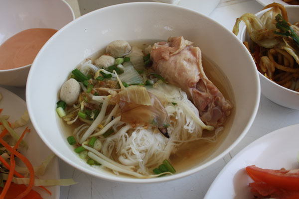 A super healthy clear Thai chicken noodle soup with glass noodles, fish balls, beansprouts and boiled chicken drumsticks, topped off with a bit of scissor-cut chive.