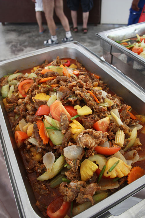 Thin slices of cooked belly pork first cooked and then deep fried (mu krop) in a slightly sweet chili sauce with cucumber, sauteed onion, pineapple, baby corn, carrot slices and tomato wedges.