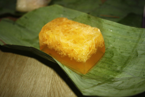 Another khanom wun, this one without coconut cream and thus even less flavorful than the first. Not really sure what those threads on the top are, maybe dried shredded egg yolk. But they did little to nothing to save this dessert from blandness.
