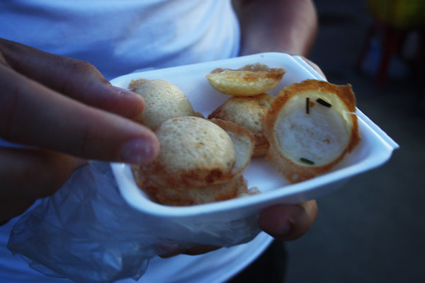 Khanom krok. Coconut griddle dumplings. A savory pancake mixture is poured into an iron griddle with egg shaped holes and cooked until little bowls are formed. These are then filled with slightly sweet coconut jelly and topped off with spring onion or corn kernels. Absolutely delicious and simple bite-sized snacks. The outside is a bit crispy and charred from the griddle while the coconut jelly inside is juicy, gelatinous and cool. Scallions and corn add a neat twist which bring the dish back over to the savory side, despite the sweetness of the coconut filling.