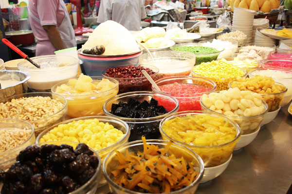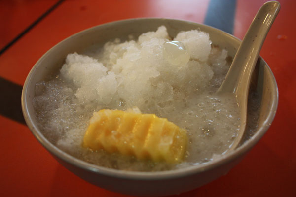 Nam Kang Sai. Shaved ice with coconut milk and stuff in it. Having already broken the “No Ice” rule with the street stall Thai iced coffee that morning, agreeing to nurse and care for any tapeworm willing to inhabit my lower intestines if it meant not missing out on delicious cool treats, I opted for this one on the spot. I had a huge variety of options, everything from dried mangos and dried ineapple, to fresh durian (ew…) to nuts to black chunks of grass jelly. I chose spring melon and —-. Shaved ice served in a bowl, drizzled with sugary syrup and condensed milk with a few spring melons and —- thrown inside for textural contrast and extra sweetness. The melon was perfectly ripe but not too sweet and still wi a bite which contrasted the cool crushed iced and e chewy hard —- beautifully. As thrice melted int the syrup and the milk, it created a sweet soupy texture which was very nice and refreshing.