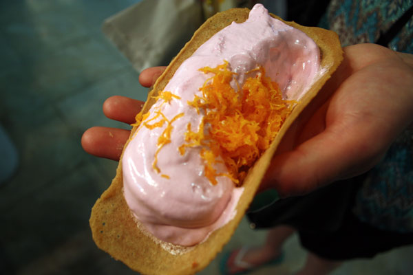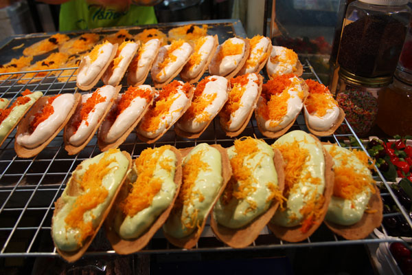 Next was something my travel companions and I agreed was the best and continued to get whenever we saw it on our trip. Khanom bueang. A very thin crepe-like griddle cake made of rice flour, cooked until crispy, folded into a taco shell shape and filled with a super light and airy, puffy cloud of whipped egg whites (pink and green food coloring to make them cool looking) mixed with coconut cream and topped off with foi thong (“golden threads”), strings of egg yolk quickly boiled in simple syrup until it dries out a bit and caramelizes. The egg white cloud was moist, sweet and airy and the lightness of it was further emphasized by the paper thin crispy pancake which cracked immediately when bitten into. The egg yolk strings added a bit of chewy, dry texture, making is a structurally complex and very interesting dessert. A bit bland on the flavor side though, simply sweet, like most Thai desserts.