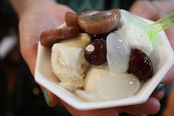Itim kati. Coconut ice cream with cooked sweet, candied syrupy banana (gluay cheum), Thai candied dates (putsa cheum) and chewy glutinous rice balls. Creamy sweet frosty ice cream made the toppings a bit tough to chew but it was a nice textural contrast. The bananas were awesome.