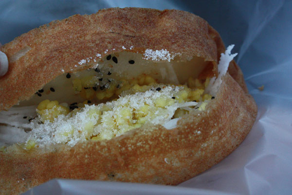 We had a similar dessert in the Patong Beach night market. Khanom Tang Taek. A crepe which was a bit thicker and chewier (but still very light and airy) which was made in a shaping iron instead of just lain flat on a pan. This cake was flipped over to form a taco pocket which was filled with shredded coconut, bits of dry egg, sugar and a few sesame seeds which gave it a slight nutty, oily flavor. Not as delicious (I missed the egg white fluff) and a bit too chewy because of the shredded coconut but not bad at all.