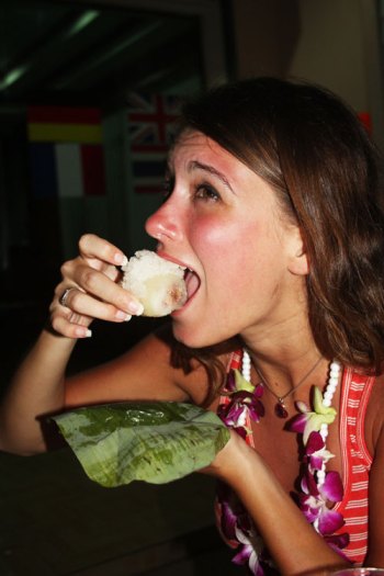 Roti gluay. Banana pancake on the beach. Similar to another pancake I had later, but instead of being stretched out by hand from a thicker, stickier dough, this pancake was made in the French way’ on one of those round oven tops with the crepe thinning thing which always looked like a record player to me. The funny thing about this one was that it was literally attached to the engine of the motorcycle which drove and at the same time powered the food stall. Both the oven top and the blender (with which a mangosteen-mango shake was prepared for me) were turned on by the vendor turning on the engine. Awesome. Back to the crepe… Fresh mini bananas and slivers of fresh, wet, white coconut scooped out on the spot on the inside, condensed milk and honey on the outside. Chopped into squares and served with toothpicks for sandy hand beach eats convenience.