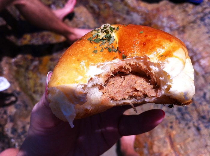 A beautiful, sunny day in Hong Kong. Before setting off on our 40-minute hike to one of the most beautiful waterfalls and beaches I’d ever seen, we popped into this Hong Kong style bakery, called the Golden Chariot Cake Shop, in Sai Kung for some snacks to munch on at the beach. The array of stuffed breads and buns was a bit dizzying. Perhaps it doesn’t seem too prudent of me to select the tuna bun to carry in the 35 C heat for an hour before consuming it, but I thought it was the right choice. The tuna inside was moist, stringy but still plump, with a perfect amount of salt. The bun encasing it was pillowy light and slightly sweet. The perfectly airy, bikini friendly treat to chow on before hitting the waves.