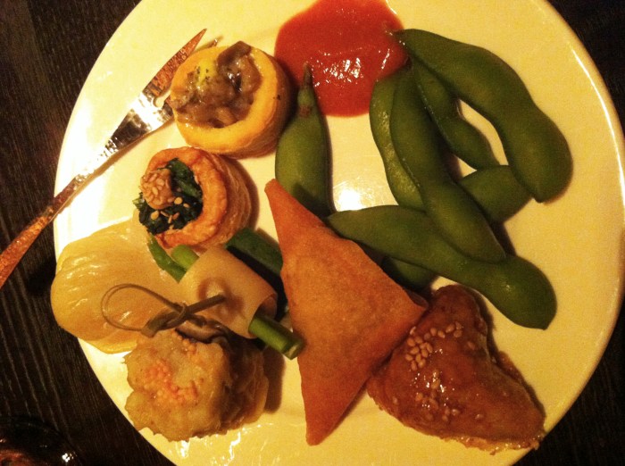 This was not that. A steel steamer full of plump little dumplings – very delicate skin wrapping around crispy shrimp. Mushy little shrimp shumai. Golden-fried little triangles of curried crab. Spicy pork samosas. Mushroom and cheese mini-quiches. Perfectly blanched edamame. A super-strong red chili sauce to dip things in.