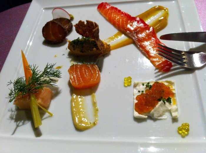 I tried the “Salmon 6 Ways” at FINDS, Chef Jaakko’s unique signature. It’s a large plate with 6 different salmon prep methods portrayed in bite-sized portions, meant to show the incredible diversity in flavor of the fish. The first is a salmon roe on a bed of fluffy cream cheese, with a few little olive oil balls (made to look like the roe) giving it extra flowery flavor. The second is a cured salmon, the typical smoked gravlax, served with a wonderful house-made semi-sweet mustard sauce. The third is a mouthwateringly luxurious, thick and creamy salmon mousse served with a bit of crunchy brown bread. The fourth is a ring of cold smoked salmon, sashimi-style with a bit of dill topping it. This one was, I think, my favorite – simple, but the piece was thick enough to show off the beautifully plump, juicy texture of the salmon. The fifth was a pastrami salmon, pan-seared and rolled in fennel and black pepper, served with a radish slice and a citrusy avocado mousse to offset the peppery spice of the fish. The last was a thick piece of pickled salmon topped with a pickled baby carrot and a pickled pearl onion. The pickling liquid made the salmon very tender, the acidity from the vinegar cooking the flesh so that the flakes slid apart in layers in the mouth and melted momentarily. It is suggested to try these bites in exactly this order, from lightest to most intense. It was one of the most interesting things I have tried in Hong Kong and I will definitely recommend with enthusiasm to those looking to find a cool dining experience.