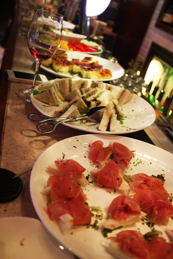 Besides this awesome environment, another great perk of the enoteca is the wide selection of happy hour antipasti finger-food. The bar is lined with innumerable plates of yummy toothpick-numnums, prosciutto di parma and salami on soft, crustless bread ( I kind of missed the rustic crust a bit here though…), doughy little buns with cheese and tomato on them, pan con tomate with crispy, toasted slices of baguette rubbed in garlic and drizzled with oil before it is topped with delicious little chunks of juicy tomato, mini quiches asparagus, eggy-smooth tortas with peas, crudité with blue cheese dip, little spoons of blanched shrimp covered in a creamy sauce…