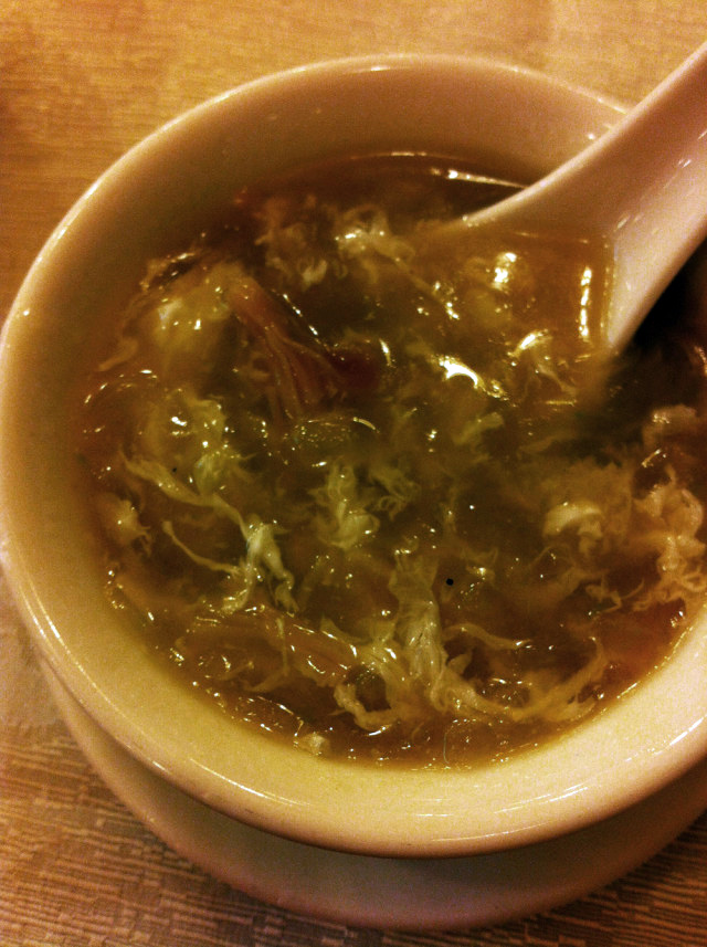 Winter melon soup with dried scallops, a local wintertime staple which we ordered next and which I was hesitant about at first. It was, however, not bad although a bit bland for my taste. The broth was a slightly gooey liquid with a chicken flavor to it and was thickened with plenty of starch. Floating poached egg whites added a soft delicate touch to it. Within the broth were suspended (as it was pretty dense) thin strips of green winter melon and even thinner strips of pulled dried scallop. The scallop was, for me, not quite enough so it didn’t really pack the broth with flavor, as I was expecting it to, and added only a very weak little stringy feel. I would’ve also preferred the winter melon in chunks, since this ingredient has very little flavor of its own and the unique texture it usually has was not really showcase by the thinner-than-julienne-job it was treated with. The broth was warm, thick and comforting, like a nice chicken egg-drop soup – nothing more, nothing less.