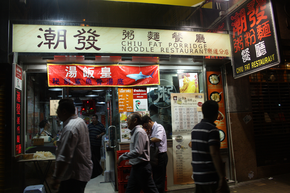 On my dad’s last night in Hong Kong, he knew exactly what he wanted to eat. His Asian favorite and truly the original comfort food of Hong Kong: congee rice porridge. I tried this stuff back in May and quite liked it, although personally a steaming bowl of porridge is not my strongest craving on a hot summer night. We found a little congee joint on Lock Road in TST called Chiu Fat Porridge Noodle Restaurant and went in for a bowl. Among the super-long list of congees (by topping), we found one that sounded just wonderful – 粥 with pork liver and century egg.