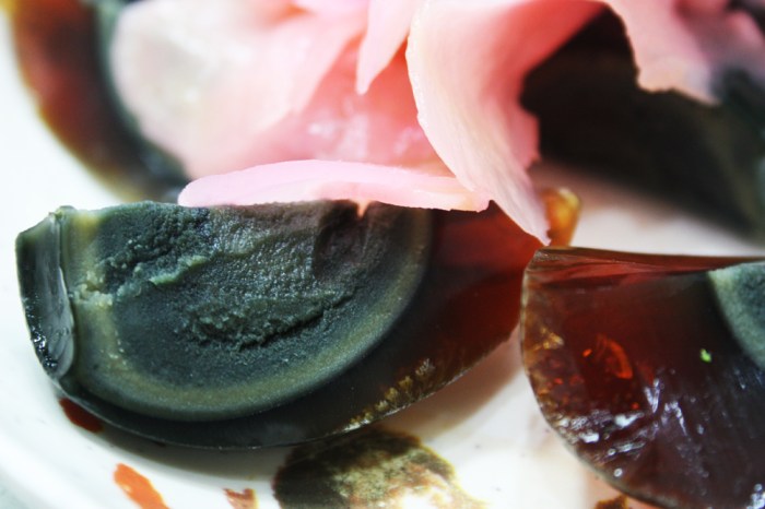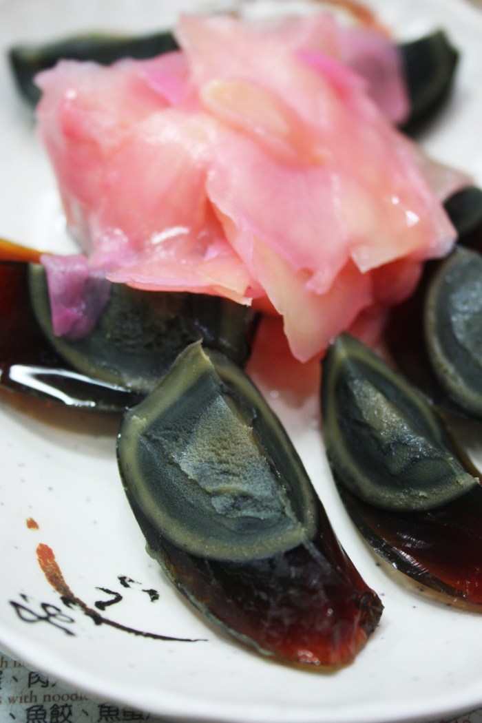 And that’s just what I did. We ordered a plate of it with ginger. I had already tried the century egg at Yung Kee a few weeks prior, but at that time it was just out of curiosity that I ordered it. This time it was for the sheer love of it. The egg was delicious. The whites were translucent and gelatinous protein, a bit like a firm aspic, jiggly, cool and refreshing. The yolks had turned from their usual bright orange color to this menacing dark blue, and were just as sinful in their flavor and texture as in their color (in a good way!) Creamy, smooth, runny, moist and much richer than their non-preserved cousins. The smell was sulfurous and extra “eggy,” which doesn’t particularly bother me since I expect an egg to smell like an egg and even if that aroma is very strong, it is still a characteristic indivisible from the egg itself. The flavor is deliciously concentrated, like that of a deviled egg with a sharp, slightly sour, slightly umami tang at the end. Serving it with extra fresh, crispy, clean pickled ginger cuts the heavy, rich flavor of the egg, lightening it a bit.