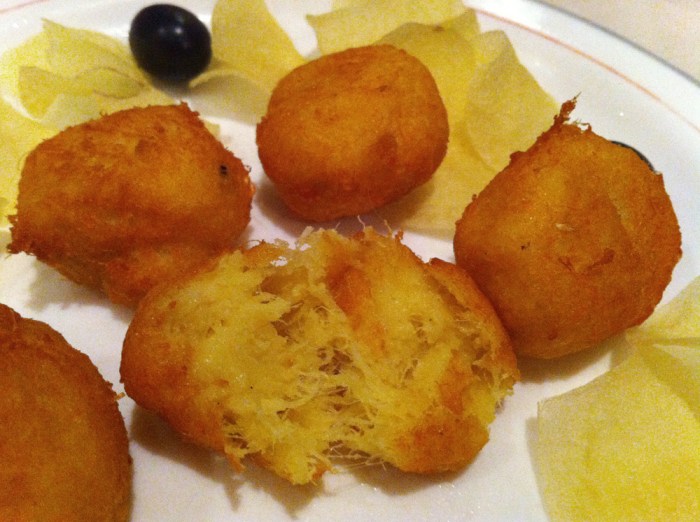 Not bad but not good, and at that moment, for the price and location and reputation of this place, I was expecting great. Although the cod cakes were fried perfectly and were not at all excessively greasy, the proportion of potato to fish was a bit off, the ratio leaning far too heavily on the former, resulting in what was more like a potato croquette than a bacalhau cake. Sure it looked good and the fishy threads made me think it was going to have much more fish flavor when I bit into it, but overall it was a bit flat and boring. This dish is also traditionally made with parsley or some similar herb mixed into the patty to give it an extra subtle flavor and a bit of color (green specs running through it), which in this case was completely lacking, even as an after-thought (no herbs – chives, parsley, or basil) sprinkled over the top. The dish could still have been saved by a nice garlic or lemon aioli, a tart yet creamy sauce to soothe the hot oil from the fried coating and pet the fishy flesh inside, but this was also absent. The only other thing on the plate were thin, oily, almost completely flavorless rice chips, which were too similar in texture and color to the pasteis to be a suitable garnish, let alone a side.