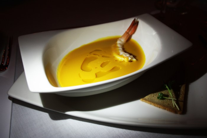 Pumpkin Soup Flavored with Lemon and Rye Bread, Steamed Prawns and Frescobaldi Olive Oil. Stunning in color, very mild in flavor. The naturally sweet, vegetal flavors of the roasted pumpkin were allowed to shine through brilliantly without too much nutmeg, cinnamon, clove, all spice, cliche autumnal seasoning to kill these flavors while, ironically, attempting to bring them out. The latter happens far too often with pumpkin-flavored anything, really, and I’m glad it didn’t happen in this bowl on this night. That being said, I thought there was a TAD too much olive oil lacing the surface of the soup (it was almost impossible to get an oil-less spoonful) and the oil, being a bit green, unripe and thus packed with youthful olive essence, threatened to overpower the subtle, caramelized roasted veggie tones of the pumpkin. A more mature and thus more subtly flavored golden oil might have gotten along a bit better. Or maybe just a drop of the green stuff would’ve been ok. Still, in the end, I found this a great dish. The steamed, undressed prawn dipped into the soup was a nice complement with its very soft sweetness accentuating the similar subtle sweetness of the pumpkin, while also adding a nice textural contrast to the dish. This was paired with the Marchesi de Frescobaldi Pomino Benefizio Riserva DOC 2010, a very crispy cool, citric and floral white. We were instructed to try pouring a tiny bit of the wine into the soup and mixing it, to allow the two Frescobaldi liquids to melt together in the company of the creamy pumpkin base. We did, and it was great. The wine lifted up the heavy, creamy texture of the soup, while adding a citric zing to it.