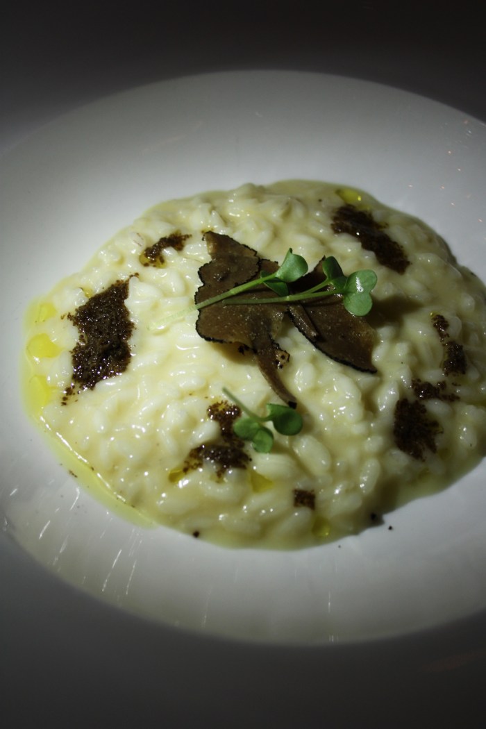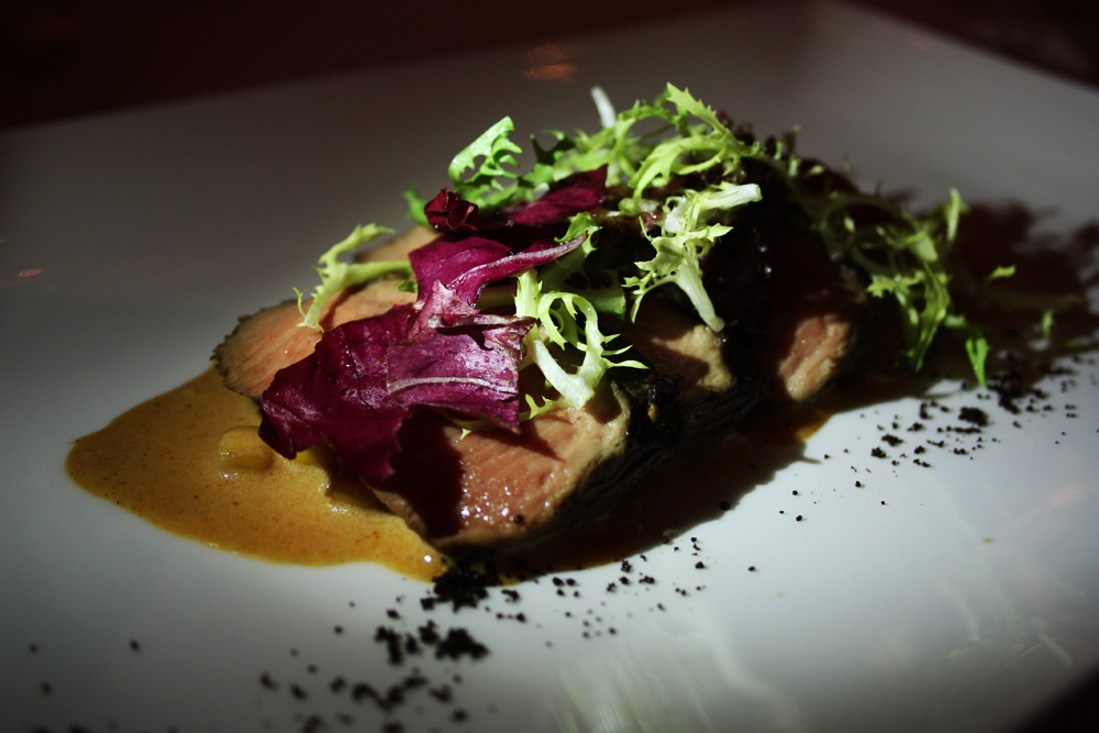 Piedmont Cheese Risotto with Coffee Powder and Black Truffle. By far my favorite of the night. The risotto was extremely delicate in its texture – a creamy, warm, comforting pudding with perfectly cooked, not overcooked, al dente rice – any heaviness of the liquid starch from the rice was lifted magnificently by that fresh, green oil drizzled over the top. The Piemonte cheese used within was surprisingly sharp at first with a blunt finish. Pungent, fungal, earthy, chestnut-hazelnut black truffle was shaved over the top of the risotto, while blobs of black truffle paste melted from the heat of the stuff, mixing its uber masculine and charismatic mineral-soil musk sensually into the risotto’s creamy, cheesy base. Peppery little watercress went beautifully with the truffle, freshening it up in texture, while adding a complementary spicy flavor. Skimming the good stuff off the top of the risotto was not an option in this case, because what gave the dish its creative flair was what lurked underneath the risotto, a bitter, grainy coffee powder which was thrown together with the black truffle (like black pepper often is) to see what would happen. The marriage was a success – the familiarly bitter sensibility of the coffee tamed the audacious, macho musk of the black truffle, bringing out the some of the softer flavors behind that fungal funk. The dish was paired with a Marchesi de Frescobaldi Nipozzano Riserva Chianti Rufina DOCG 2008, whose spicy, peppercorn tones went beautifully with the dish and whose tannins were soft enough not to kill any of the more subtle flavors within the dish.