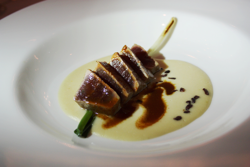 Pan Fried Tuna Loin with Wasabi Sauce, Spring Onion and Cocoa Nibs. In this case, the idea was fantastic but the execution in the kitchen was a tad flawed. I received overcooked tuna (compared to those of both of my table neighbors, one of which is pictured here) that was 8-2 rare:sear vs the 9:1 ratio I was practically drooling for. Nevertheless… The tuna was of very nice quality, purplish red and smooth, falling apart raw and cool at the grain, allowing the tongue to slip between two chilled, pillowy flakes of flesh when chewed. The sear was nice, only slightly seasoned to allow the fish to shine. The slices were leaned against a fresh, crisp but soft stalk of slightly charred spring onion in a pool of creamy wasabi sauce and drizzled in a soy-based salty pan-jus. I thought that the wasabi could have been a bit more powerful in the dish as an eye-moistening, lymph-node-opening icey cool spice because the tuna was already very subtly seasoned and thus looking for some strong flavor besides its pan juice. The cocoa nibs sprinkled into the sauce provided deep, earthy, bitter cocoa flavor but only when directly crushed between the teeth, so they didn’t really bleed out any of their essence into the sauce or add it to the fish. The dish was paired with a salty, woody, mineral Marchesi de Frescobaldi CastelGiocondo Riserva Brunello di Montalcino DOCG 2003, which I thought a bit too heavy with the tuna, especially since the latter was, in the end, not seasoned very strongly.