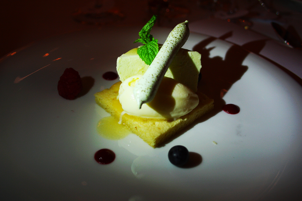 White Chocolate and Lime Mousse, Orange and Fresh Fruit Infusion. A wonderfully light, interesting and creative dessert. A velvety smooth mousse of sickly sweet, vanilla-wax white chocolate and tart, green key lime lifted up by an aromatic, perfectly positioned sprig of mint. Besides it, a cool dollop of refreshing orange sorbet, melting nicely onto a buttery, flaky lemon shortbread. A crispy pistachio-ed log of airy merengue lying over the thing, adding nice textural contrast. Tart little blueberries and raspberries, as well as specks of raspberry syrup dotting the plate. This was paired with a Marchesi de Frescobaldi Pomino Late Harvest DOC 2007, a very nice, creamy wine of citrus, orange and honey which matched it beautifully.