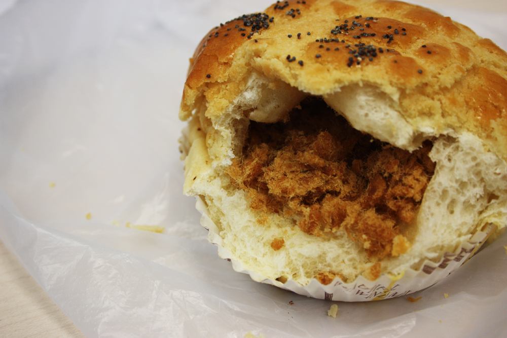 Ladies and gentleman, the Pork Floss Bun. This one definitely goes down in the books as my number one. The bun itself is beautifully fresh every morning, doughy, soft, virginally white, moist and very slightly sweet. The top has a beautiful, slightly browned sugar lattice crust, no doubt glossin’ from an egg-wash and this gives the pastry as a whole a slightly deeper, toasty sweetness and a crumbly texture to go along with the pillowy airiness of the rest of it. What lurks on the inside is a generous portion of dry, super salty pork floss which has the texture of thick, fluffy cotton candy and the flavor of pork rinds seasoned with soy sauce. A wonderful combination with the almost neutral flavor of the dough and the sticky sugariness of the crust, a perfect treat for breakfast lunch or dinner. And at 1 USD, truly a great value as well.