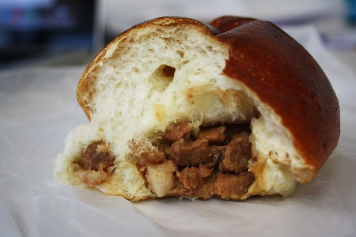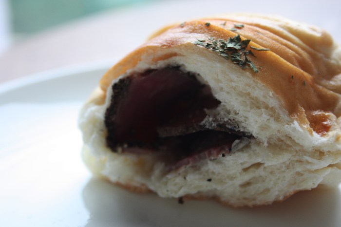 Roast Beef Bun. The perfect midday snack. A delicious feather pillow bun very slightly browned on the outside with a generously thick slice of pastrami on the inside. The pastrami stays cool and firm and has a wonderfully seasoned black pepper, coriander, garlic flavor to it. It’s like a humble version of a pastrami sandwich, understated, light, with only the flavor of the seasoned meat and not the dense, moist texture of it. A bit of dry herb sprinkled on top of the bun echoes the meat’s herb crust within. Pretty and delicious.