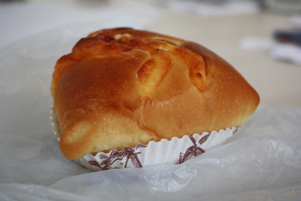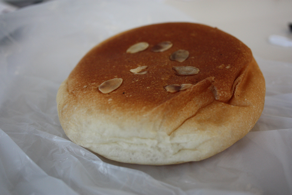 Red Bean, French. Don’t exactly know what makes the bread “french” as the name suggests, but I do not its enormously satisfying. A slightly flattened version of the same airy, slightly chewy, remarkably fresh white bread, browned lightly at the top and covered in white sesame seeds which toast up during the baking process, contributing a wonderfully nutty, oily and delicious flavor to the bread. The pouch is filled with a thick, starchy, very dense red bean paste which is slightly sweet in a roasted and caramelized root vegetable kind of natural way. Toasted up a bit in the oven or even warmed for 5 seconds in a microwave, this thing is a wonderful accompaniment to coffee at the office on a dreary Monday morning.