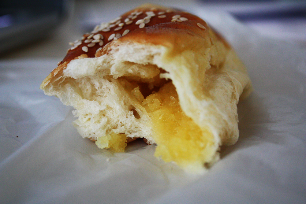 Cocktail Bun. This one is a popular one, a baked good native to Hong Kong. I did some research on it and found out that it was originally created in the 1950s when the owners of bakeries decided to reuse unsold day-old buns by grinding them up, mixing them with sugar and coconut and stuffing this mixture inside fresh bread dough. The name is a play on the comparison of this mixture to a bartender’s cocktail mixture. Since those times butter has also been added to the mixture to soften it a bit and give it a smooth, rich consistency. I love these. The bread is very soft, very subtly sweet and quite pretty with the slightly browned exterior and sesame seeds baked over the top. The filling is dense (no doubt from the ground day-old bun), sweet and buttery and reminds me a bit of the filling of an almond croissant, only with a more floral sweetness from the coconut instead of the toasty nutty sweetness of the almond paste. The lightness of the dough lifts makes up for the heaviness of the filling perfectly. A fantastic breakfast indeed!