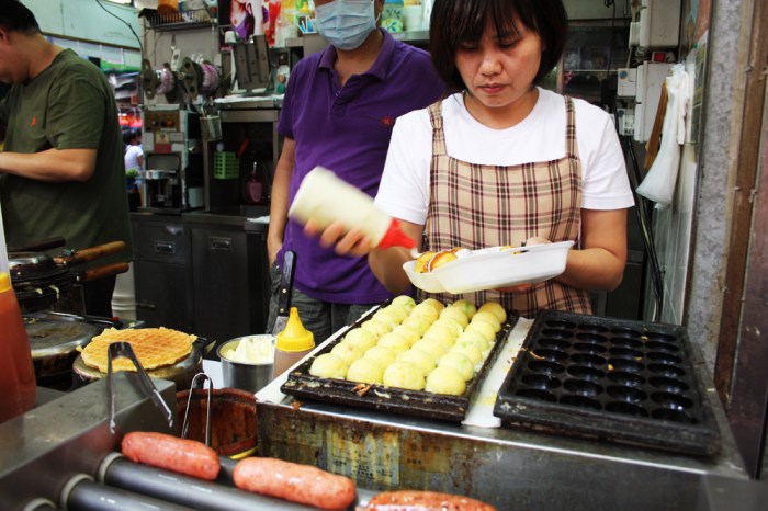 My “last few days in Hong Kong street food adventures” continue with another favorite I recently discovered in Mong Kok – the Japanese style octopus pancake ball called takoyaki. A nice escape from grilled innards and sketchy street meatballs, this Japanese delicacy is one I am definitely returning for. What originally drew me to it is the attention this lady was dedicating to the preparation of the little balls, constantly adding batter to some of the round griddle molds and rotating the bits that needed to be rotated. The toppings she added also aroused my curiosity and the crowds of people ordering it helped with my confidence in ordering it as well. At the beginning I thought it was just some version of the Hong Kong waffle, which I have already tried and wasn’t particularly amazed by. I far preferred this stuff to the latter.