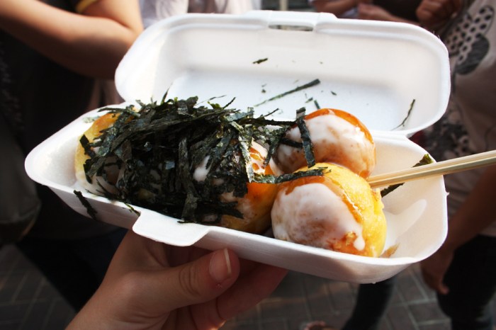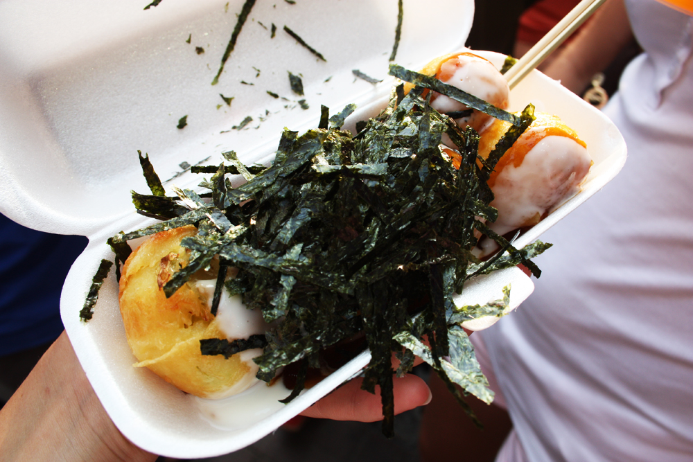 Fluffy, airy, eggy pancake balls made of wheat flour. Soft and pillowy on the inside and grilled golden brown on the outside. The batter itself is slightly sweet but has a very mild flavor and the fact that the balls are grilled instead of deep-fried makes them crispy without being drenched in oil. The inside is moist (though not undercooked), with the interior of the batter melting together and almost fusing with the gentle, glossy spring onion filling. When I asked the lady what the thing was, she answered “octopus” and I really didn’t know what to make of this answer until I took my second bite of one and found a tender, only slightly chewy chunk of octopus tentacle, no doubt left over from the octopus on the stick treats sold at the other end of the same stall. On retrospect, the octopus did actually add quite a nice little marine something to the snack, a very slight sweet-shrimp-octopus flavor which blended with the spring onions very nicely. The takoyai was drizzled first with special takoyaki sauce, which is thick sauce similar in color to BBQ sauce, but similar in flavor to Worcestershire, salty with a bit of garlic, tomato, soy sauce, dried fruits and vinegar mixed in. Although takoyaki is traditionally also topped with mayonnaise, these were drizzled in a white syrup which seemed a bit more like a sweetened condensed milk and blended with the salty takoyaki sauce very nicely to produce a sweet-and-salty duality in the dish. The balls were also sprinkled with dried aonori seaweed strips which wilted a bit when touched by the moisture of the sauces, producing a nice half crisp and have chewy texture, while the ones that were left dry stuck to my teeth…in the best possible way. The seaweed also echoed the marine ingredient inside the pancake, while not conflicting with the sweetness of the batter and onions. A very well balanced, delicious treat indeed!