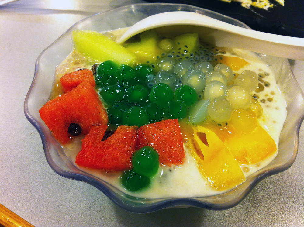 Next up, something much better, Sago Sweet Soup with Grass Jelly, Aloe Vera, Basil Seeds, Glutinous Rice Balls and Fruit. Sago pudding- a bit like tapioca, except with smaller little chewy beads – sweetened with coconut milk, creamy white and delicious. Submerged in the stuff were cubes of jiggly, flavorless black grass jelly and aloe vera. A heap of fresh honeydew melon, watermelon and peach piled on top, along with chewy little multicolored balls of glutinous rice ans some funky little basil seeds, which gave a slippery smooth texture of caviar to each bite. Still a weird overall combo of textures for me but not bad at all.