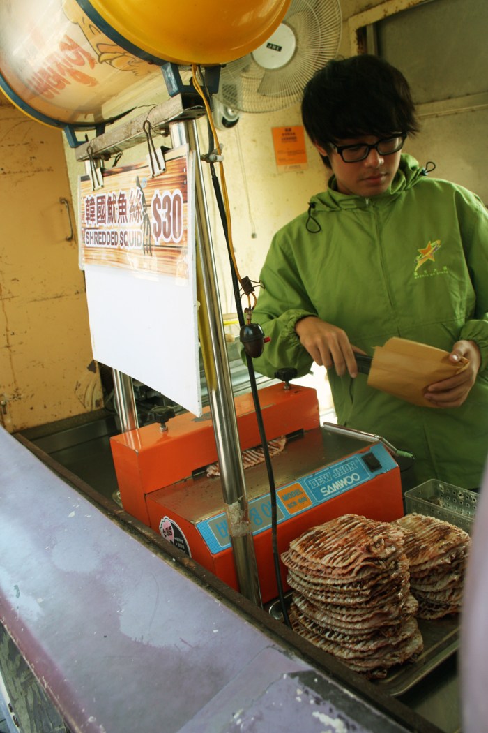 The prep process is not a very complex one. The guy takes a thin slice of squid and passes it through an iron machine which grills the thing, while shredding it into thin strips. I’m pretty sure that even the flavoring takes place inside of this machine, whose two sides are probably coated in the seasoning that attach to the squid as it is squeezed through. If not, the machine definitely helps season in that it pushes the spices into the flesh as the latter is forced through.