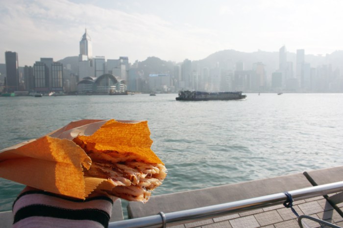 A few days ago I was walking down the Avenue of the Stars in TST, enjoying a sunny afternoon with my dad and gazing at the Hong Kong skyline from the boardwalk, when I came across one of these squid stalls. Now, I’ve seen these around before. They pop up in places like Disney World, Ocean Park and The Peak, family-friendly spots where annoying little kids are inevitably begging their parents for something to satisfy their oral fixation with. Grilled and shredded squid is kind of like the cotton candy or corn dog of the West. Carnival fare.