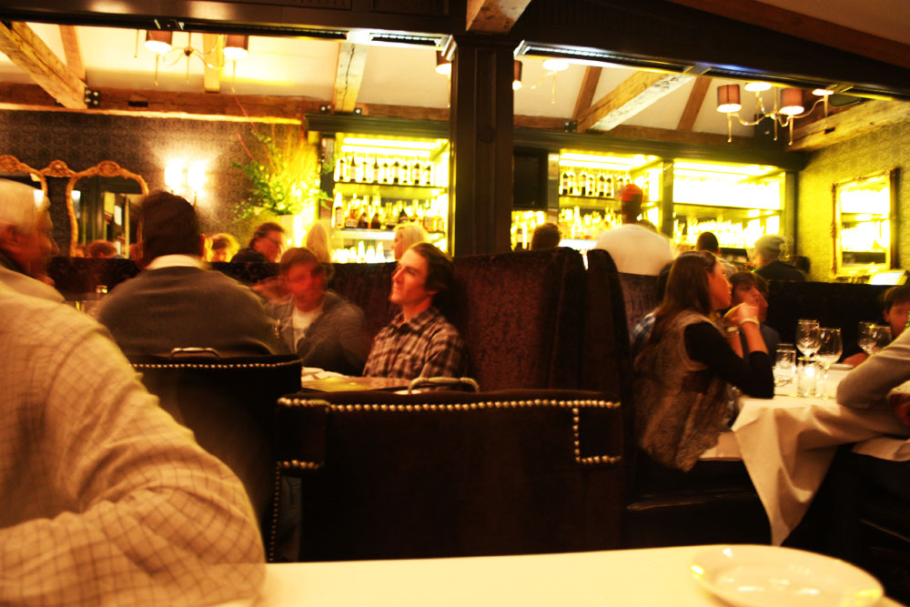 As a way to celebrate the new year, our survival of menacing ice-coated moguls and hypothermic moments on the lift up to Lodge Peak, my sister-in-law’s successful submission of a pretty significant geology paper and my brother’s kindof successful astrophysics lecture on how to find black holes in the universe, we decided to go for a nice juicy steak on our last night of the trip. Many reviews recommend Steakhouse No. 316 as the best place to get just that in Aspen, so we decided to go for it. Making a reservation over the phone went smoothly and the place was pretty easy to find as well. From the outside it doesn’t look like much more than a glorified log cabin, but the interior is elegant, homey, with a bit of a New York steakhouse gimmick running through it. Coats are kept under a heat-lamp in an indoor reception area, a detail I appreciated considering the 4F out. A sleek marble-top bar faces a selection of backlit liquors and a unique wine-tap from which bold reds flow forth at affordable prices (no bottling, labeling, etc.). Crimson velvet banquettes and comfortable leather sofas, white linen, big boy steak knives. The place was packed, as it was the night before Day 1 of the X Games, so the vibe was great – bustling, busy and chattery without being too distracting. Lots of pro snowboarder eye-candy in there too, which is never a problem…