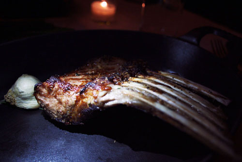 Rack of Lamb. A juicy and succulent medium rare with a great sear on the outside, not too thick in smokey flavor, but maybe a bit too salty. A lot of meat on the bone and all of it very deep in that mineral lamb twang. Came with a clove of roasted garlic on top, in a shallow cast iron pan. The latter was a tad awkward to eat out of, as it required us to cut the meat at a higher angle, but it also kept the flesh warm until the last bite, which was something particularly important to us on such a cold night.