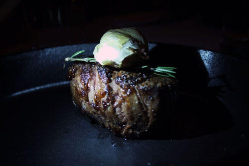 A pretty satisfying filet mignon, with very bold flavors (unlike the mildness of real Kobe beef), cooked to a nice medium rare, with the inside still juicy and bloody but warmed through. The meat was dark magenta (darker than that of real Kobe) and had great marbling – lean but buttery smooth. Again, a roasted garlic clove over the top and some rosemary for an extra punch.