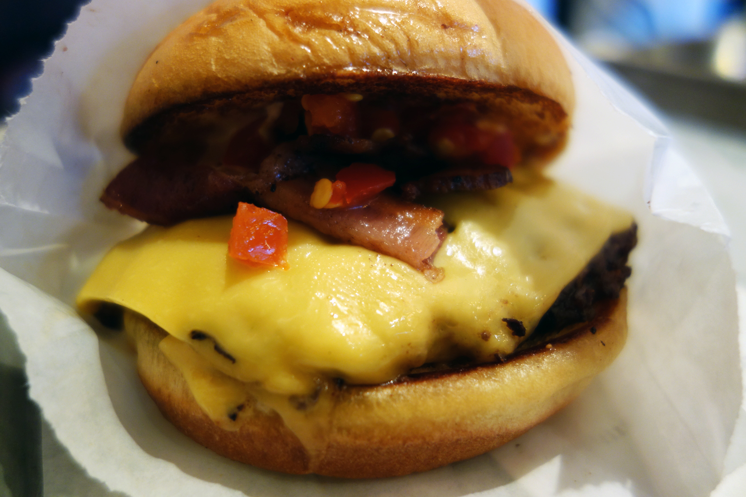 When my early-dinner companion jumped back in line, like the wonderful gentleman he is, to get some more stuff to soothe my ravenous appetite with, he surprised me with the SmokeShack, a cheeseburger topped with Niman Ranch applewood smoked bacon (look at that, jumping on the ingredient appellation trend), cherry pepper relish and Shakesauce. The evil powers that be – namely, Ronald and the King – have done everything in their power to tarnish the reputation of bacon-burgers everywhere, single-handedly solidifying (at least in my own mind) the concept of bacon+beef patty(+cheese) with the dread of oily, over-salted piles of satfat, which will leave one in even more of an uncomfortably satiated state than its already horrible bacon-less little bro. However, it seems there is still some light left in a world of greasy darkness. And it comes in the form of this guy, right here.