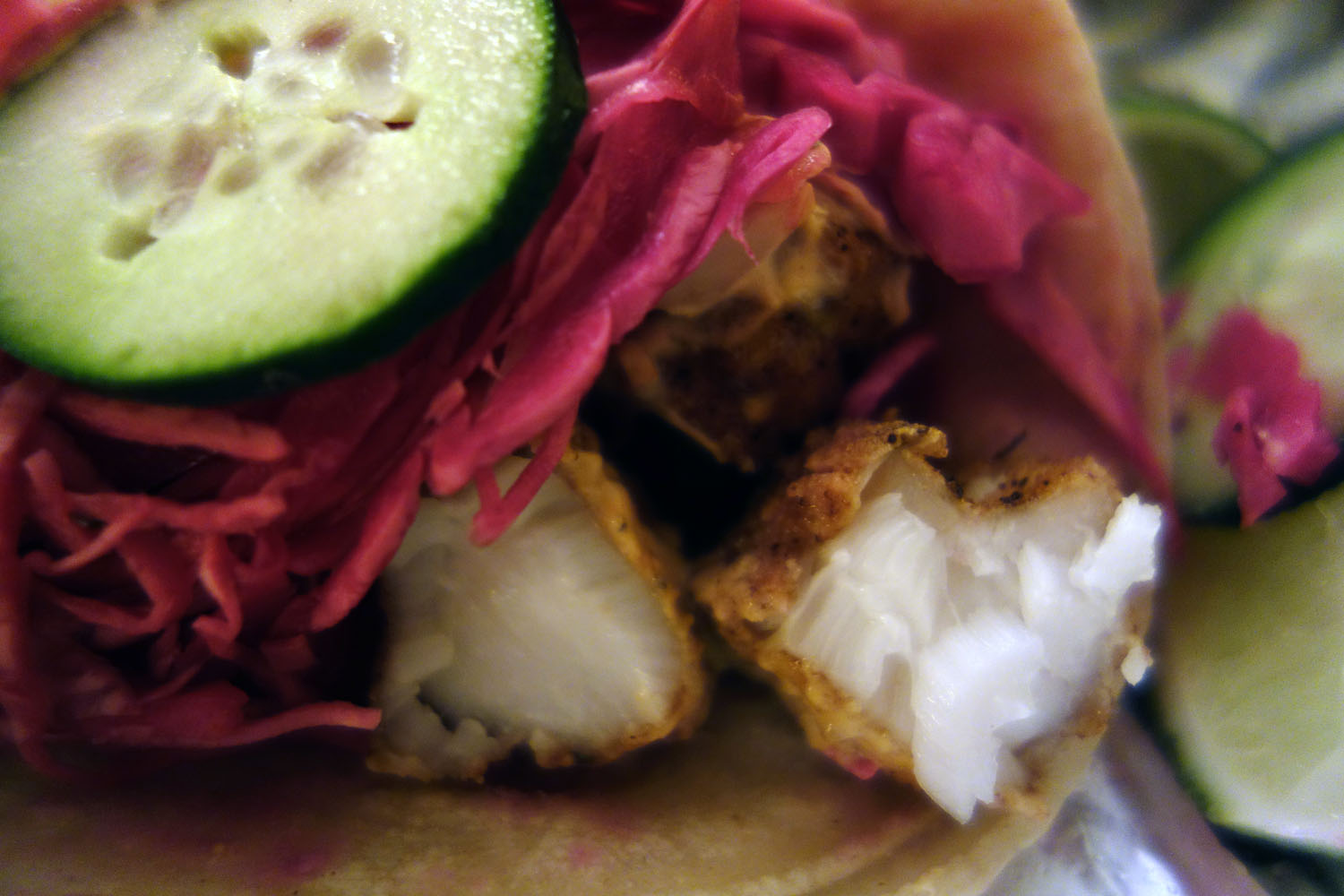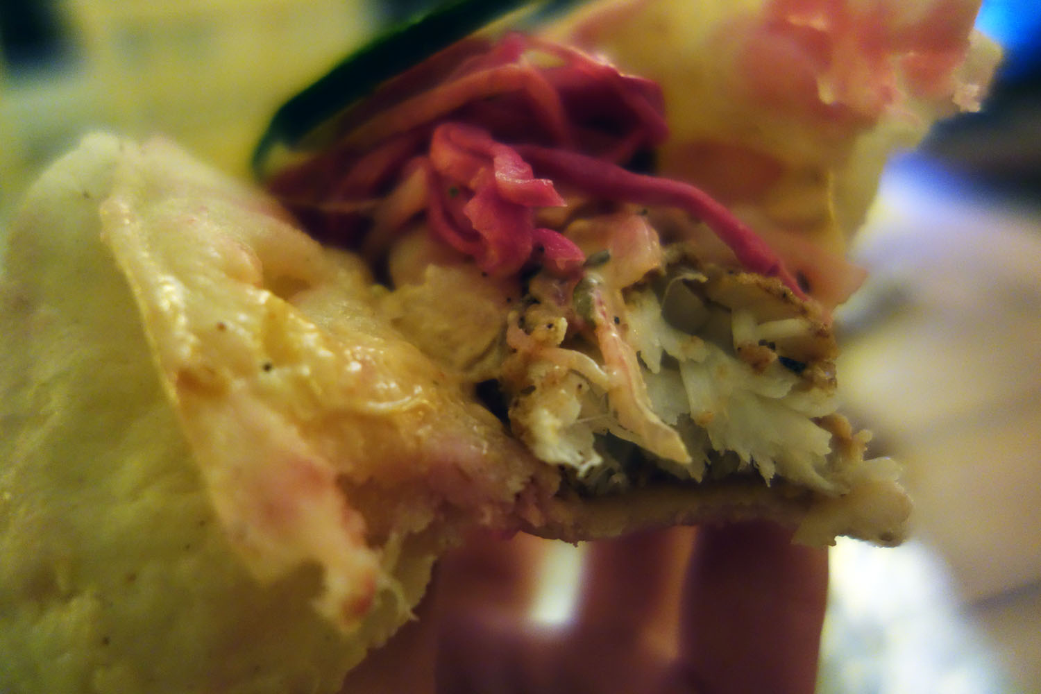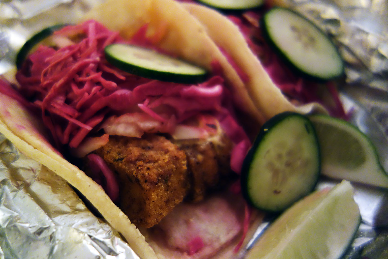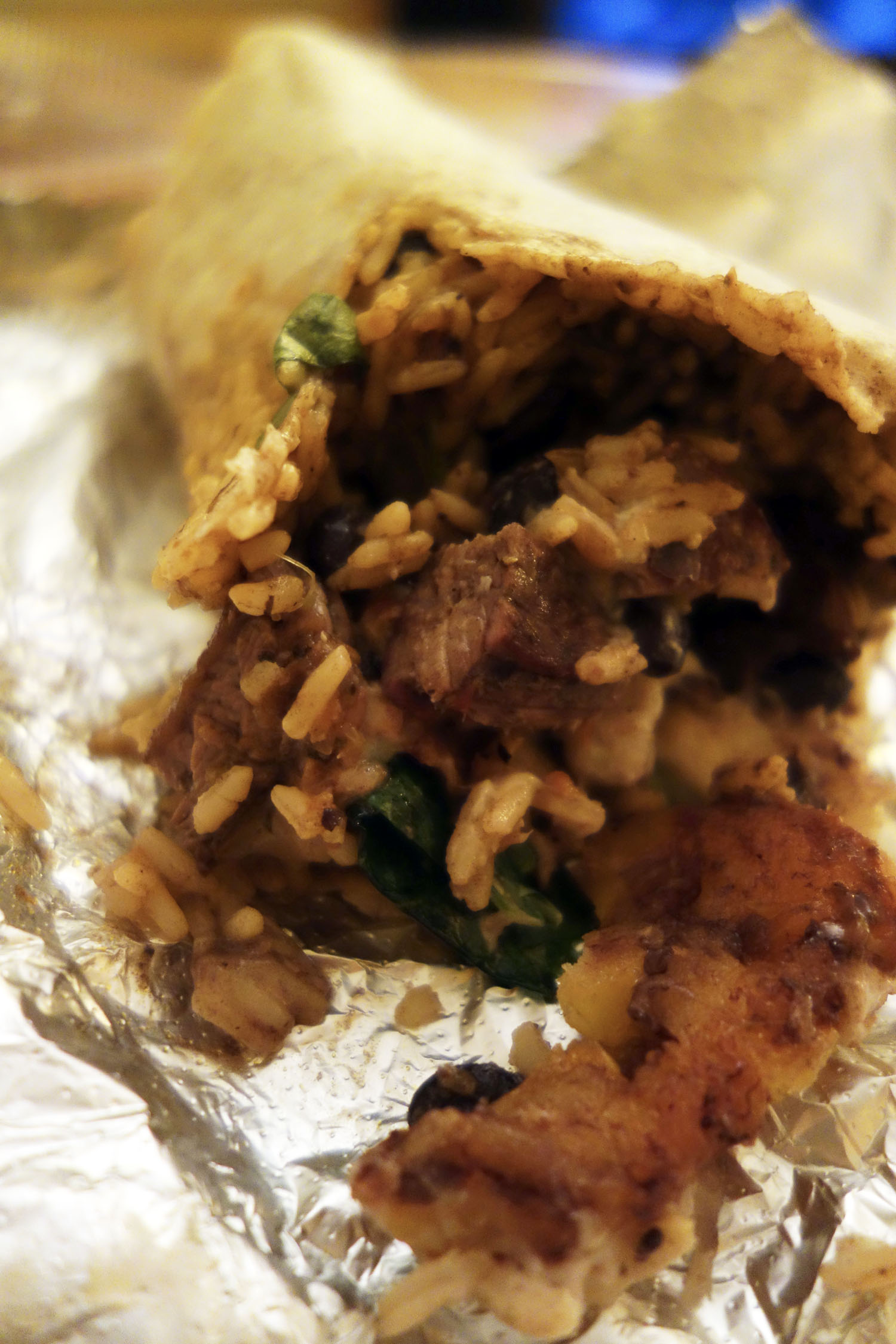And since the Fenway location rebuilt in November 2011 (unfortunately, while I was still in Buenos Aires), it seems to have completely risen from its ashes, like some sort of savage, beautiful Mexican phoenix. The restaurant is packed on most nights, and people can be seen stuffing their faces with rice and beans on the benches outside even during the colder days of winter. Loyalty of the local community fan base is the name of the game here. I am ashamed to admit that I myself have not been so loyal. Since the place burned down I hadn’t been back. I had passed by it daily on my way to and from the gym (yeah… I work out…) but I never thought to give the new version a chance, suspecting that it would not measure up to its (and my) formative years. Until tonight. Tonight, sentimental from my impending move, I strolled in and asked the counter lady what their signatures were, in order to assess how much the menu has changed. It hasn’t. The signatures are the same, the fan favorites – the cornmeal-cod tacos and the funky-ingredient burrito. I got one of each and some carnitas for extra measure.