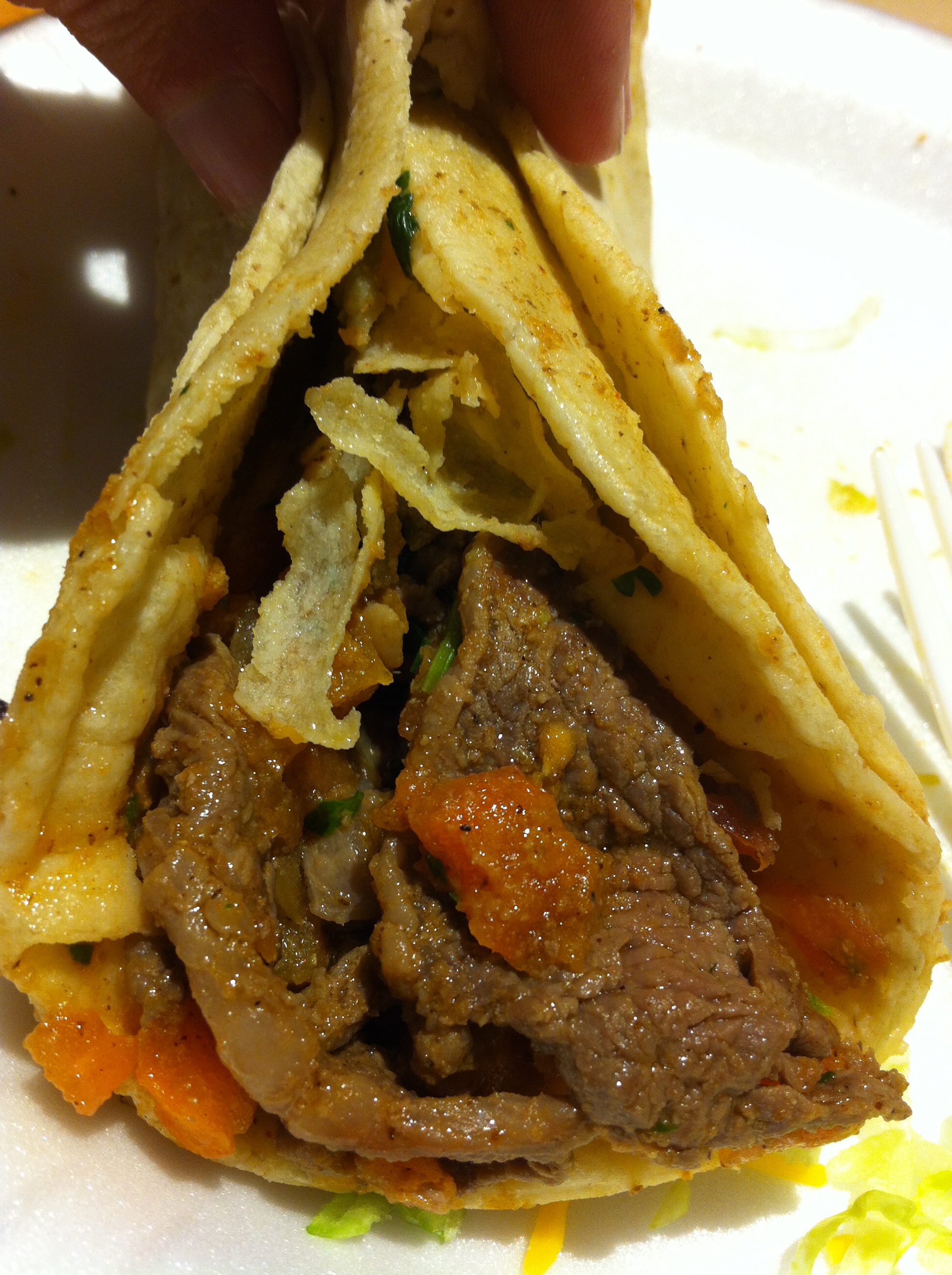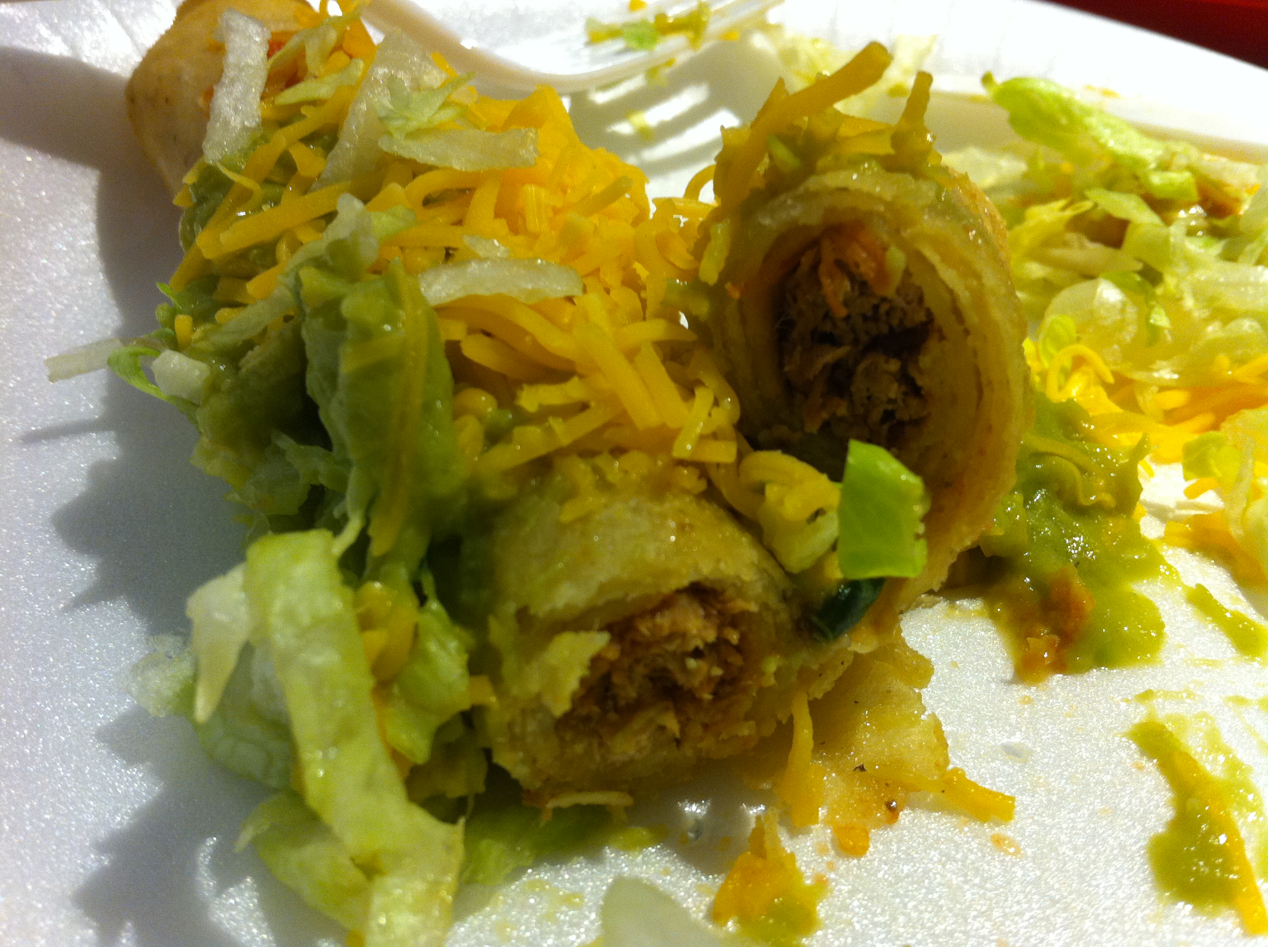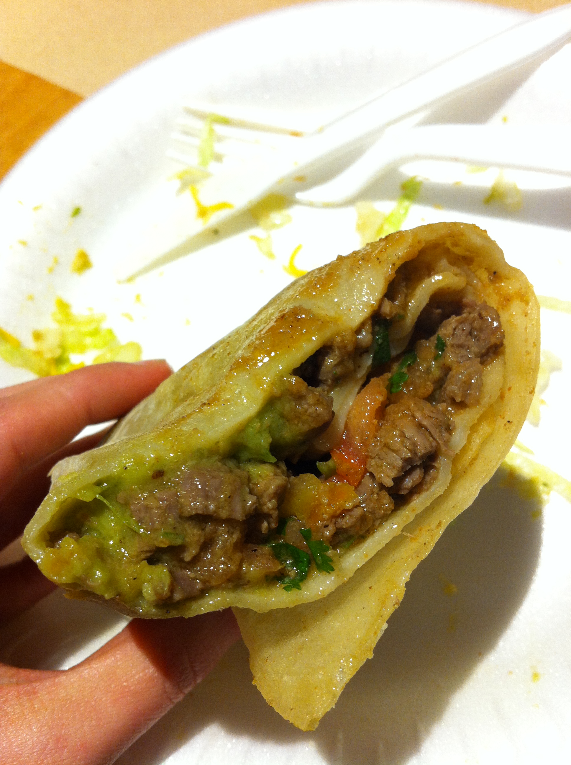 Having had kind of a meh experience with my first ever taquito, I was nevertheless eager to give it another chance. I got El Indio’s Shredded Beef Taquito, which came with lettuce, cheese and guacamole. For me, the fried corn tortilla was uncomfortably chewy, making it awkward and a bit painful, even, to eat. The thing was wrapped around what really could’ve been anything three times, suffocating the filling to the point where I could barely recognize it as beef. The individual bits of beef I pulled out were not bad, but the texture of the meat disappeared completely inside the taquito. The guacamole was just okay and didn’t really do much besides glue the plasticky bits of shredded whatever cheese and lettuce into a goop that topped the taquito and made it even harder to eat. Apparently this is the creme of the taquito crop. Maybe I’m just not a taquito kind of gal. Someone told me afterwards that the one to try was actually the shredded chicken taquito, though I really don’t think this would’ve made a difference.