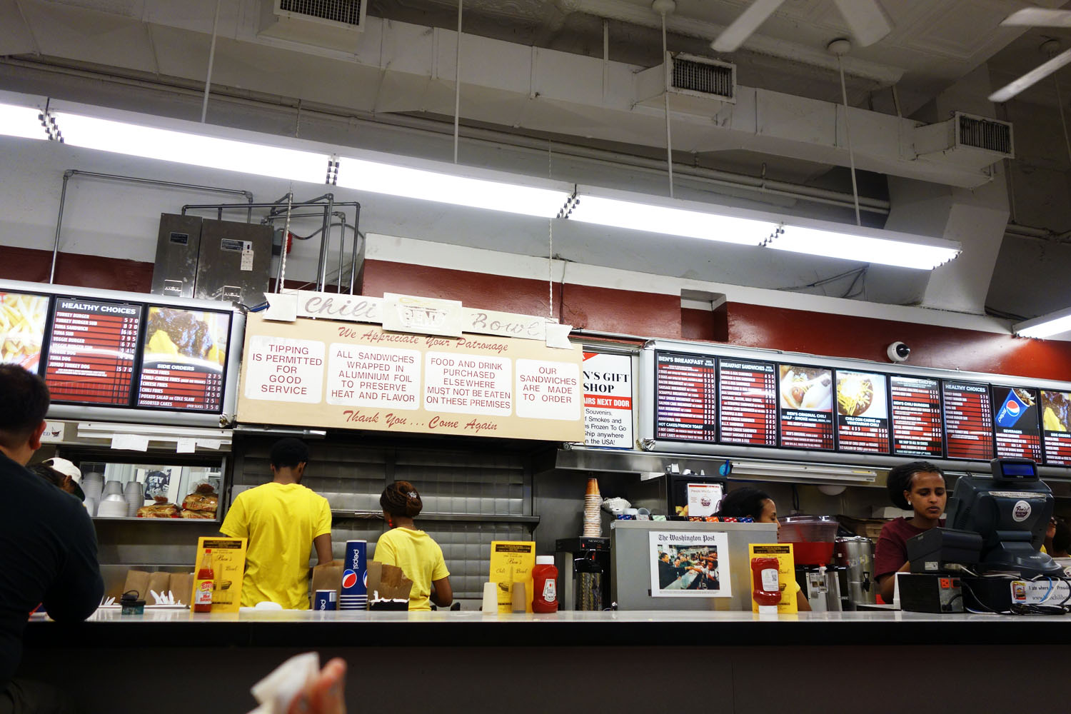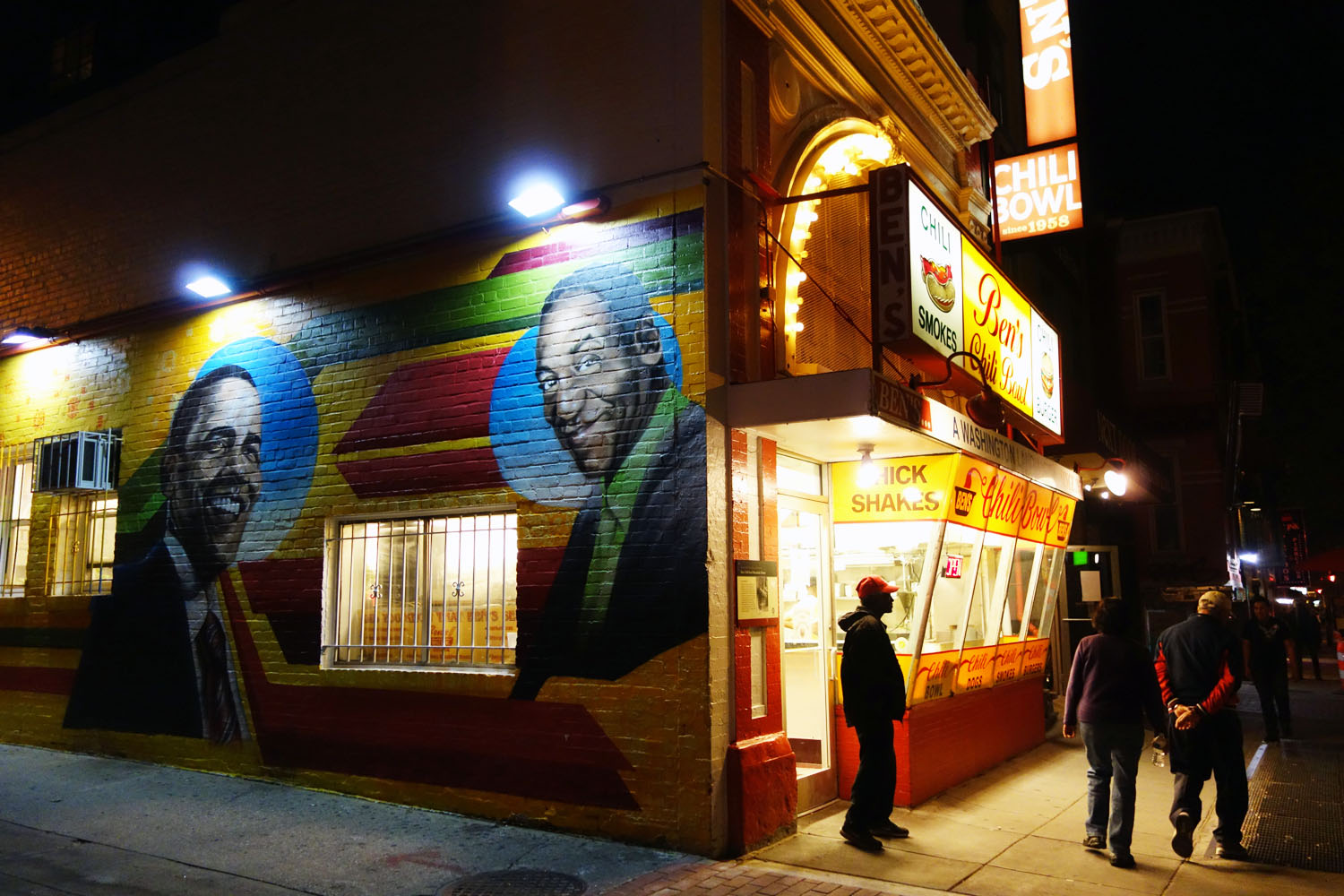 It’s called Ben’s Chili Bowl and it has a history. It was around when U Street was Black Broadway, before it turned into Generic Taverns and Pubs and Neon Margarita, Chips and Salsa Hang-Outery Avenue. It had the cojones to stay open during the riots following Martin Luther King’s death and during the drug years that followed that, never ceasing to feed the masses through the good, the bad and the ugly. Celebrities love it and have always loved it. Having survived the gentrification around U Street, Ben’s has become a bit of a landmark and therefore a bit of a tourist spot. The T-shirted crew put up with the picture-taking and the checking in. Prices have raised, obviously, but not to an obnoxious level. And, while the interior of the place has pretty much been converted to some creepy “this is what a diner used to look like” museum, with a flat screen playing Ben’s proudest TV appearance moments, out front is actually pretty chill. Big, very lightly lit, clean, comfy stools and booths.