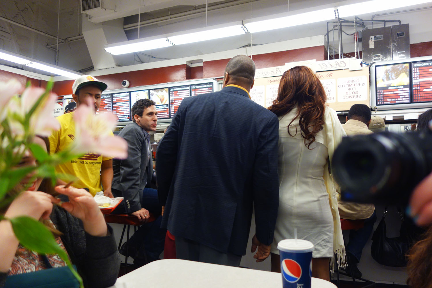 We went on a Friday night and luckily it was still too early for a line. I ordered one Original Chili Half-Smoke and one pink lemonade and my friends did the same. It’s pretty simple. They have other stuff on the menu but not too much, which is always a good sign. It’s pretty much chili, all-beef frankfurters, half-smokes (50% pork, 50% beef sausages), burger patties and bread and any combination of these. There are some “healthy options,” like turkey, tuna and veggie stuff, but mostly it’s about the chili and beef combo. Sides are fries, cheese fries and chili fries, cole slaw and potato salad. As we sat waiting for our food, the Neelys (from the Food Network) walked in wearing fancy clothing and were greeted with a bunch of people taking pictures of them. Being more of a Travel Channel type of gal, I don’t really watch the Food Network so I didn’t put too much effort into snapping a good one of the celebz. But I got their backsides….