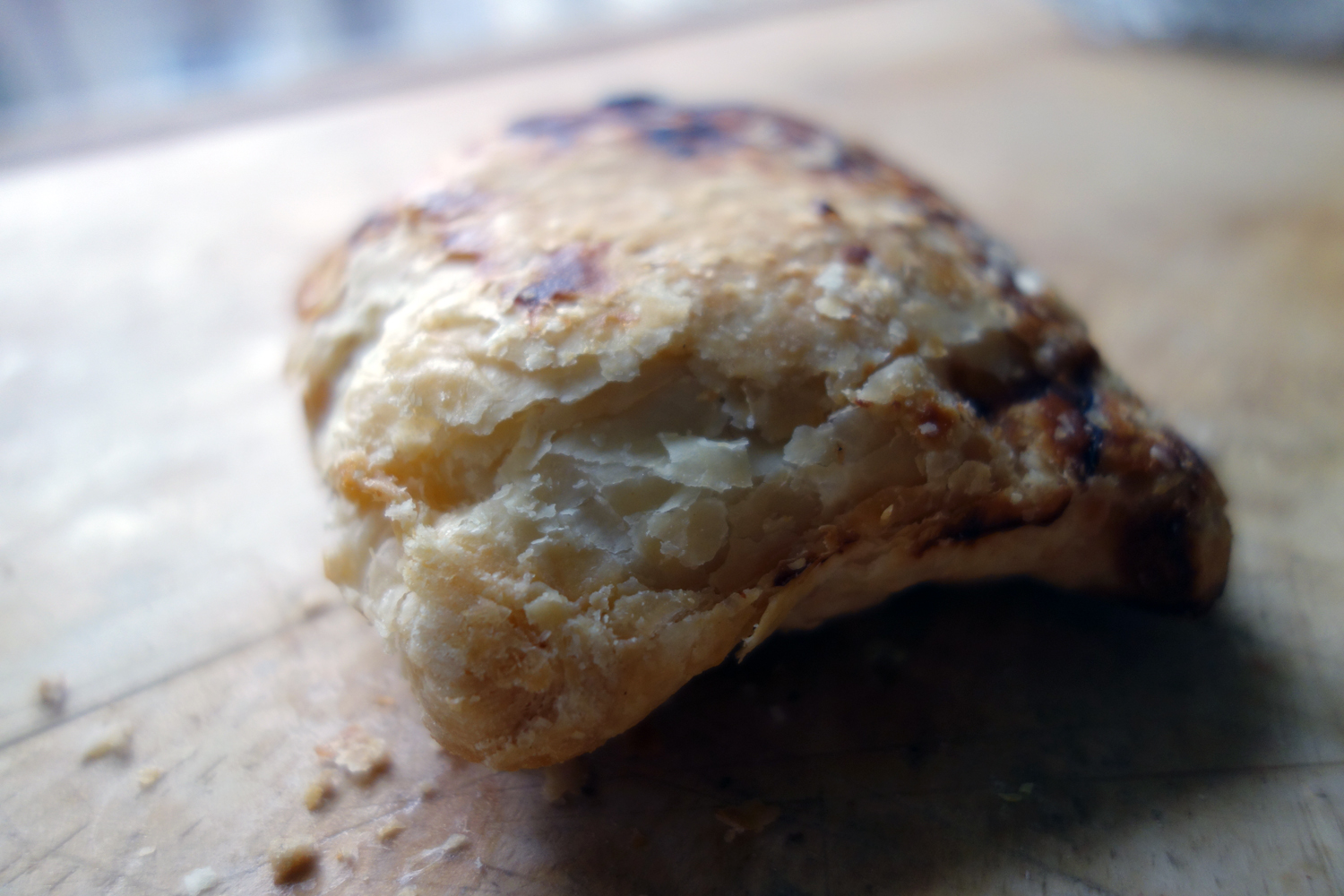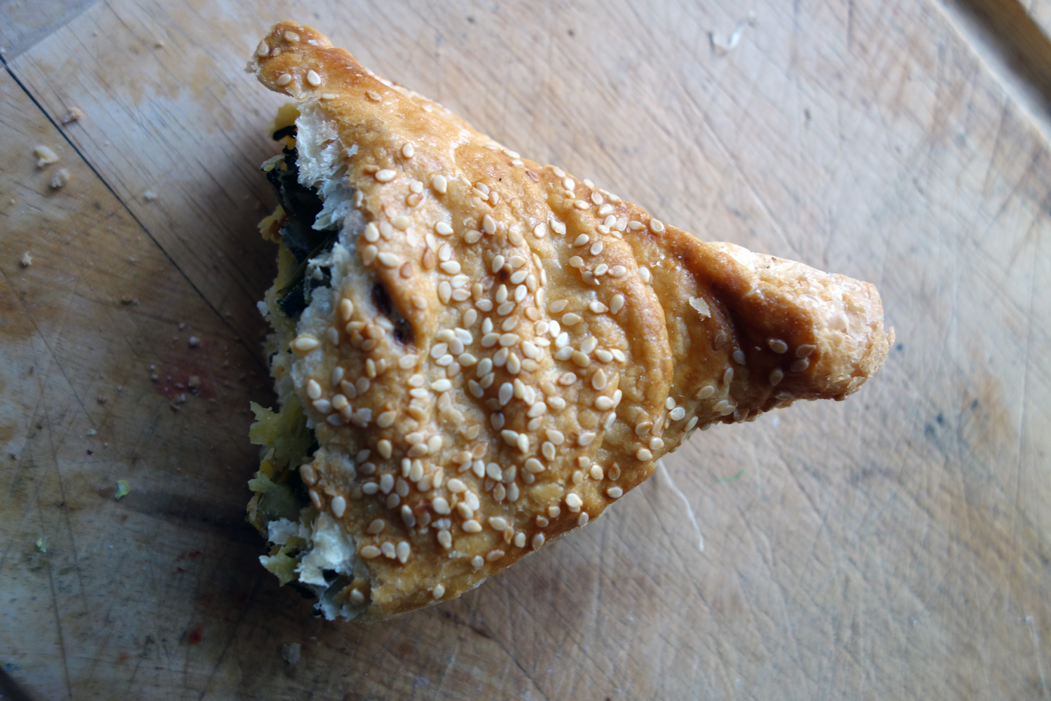 Pirozhki (пирожок, kind of…) with spinach and feta, but in this case made with a flaky puff pastry, shaped into a triangle and sprinkled with white sesame seeds instead of the baked yeast dough buns (similar to the baked bao in China) otherwise popular in Russia under this name. I love buttery puff pasty and I love spinach and cheese filling but in this case, the thing was a bit too stiff, probably because we got it in the afternoon, after it had been out of the oven for a while. Reconstituting it a bit by throwing it in the broiler might have fixed it up significantly but, well, I was too impatient to do so. While the texture was a bit too dense and stiff, the flavors were great. Tangy, sharp feta made green with slippery smooth threads of spinach running through, wrapped in a crispy, flaky pastry that fell apart into little scales that melted into butter on the palate.