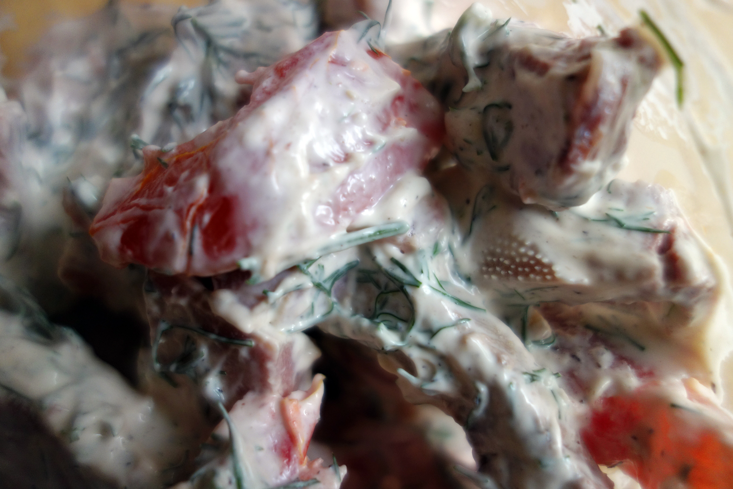 Vinegret (Винегрет) is probably one of the most quintessentially Russian salads (or dishes, in general) out there. It is made of finely chopped beets, potatoes, onions, carrots, some strands of pickled cabbage and very lightly pickled cucumbers, dressed with sunflower oil (not vinegar). Besides being shockingly vibrant in color, which always reminds me of the hair color of older Eastern European ladies rocking the 80’s short hairstyles, it’s a pretty healthy salad when not drenched in oil. The beets dominate in their mineral, root flavor, with the pickled cabbage and cukes adding some acidity to offset the oil and the murky ground flavor of the root. The potatoes add a nice hearty body to the dish, making it pretty satisfying even when consumed on its own. And, as with most beet-centric Ruski dishes, some dill is added to lift things up with its clean, summer flavor and aroma.