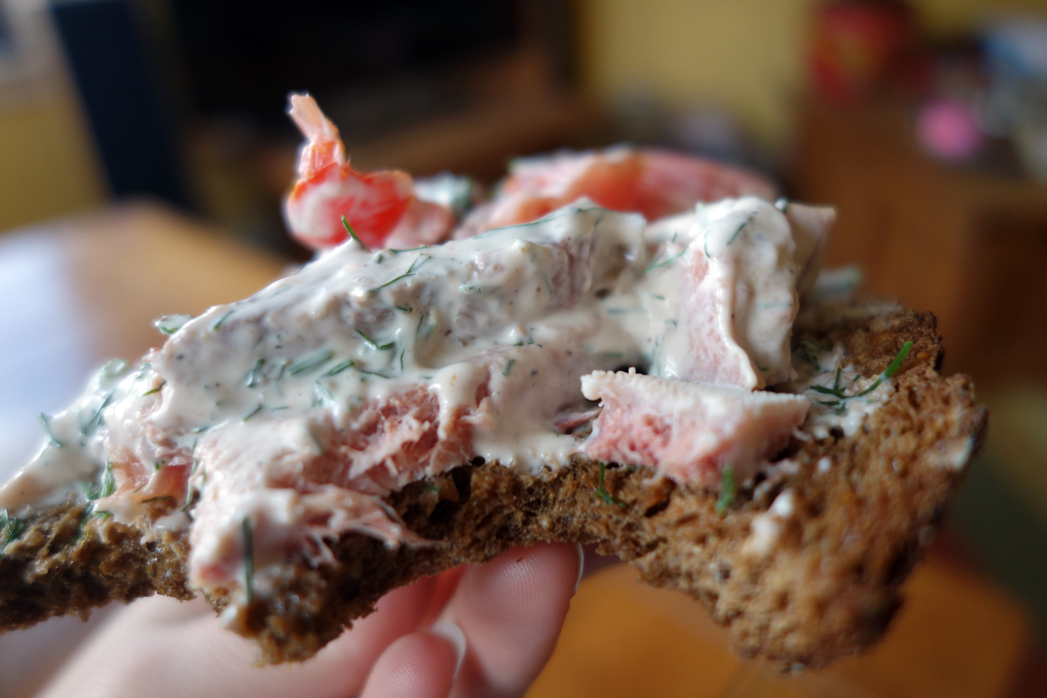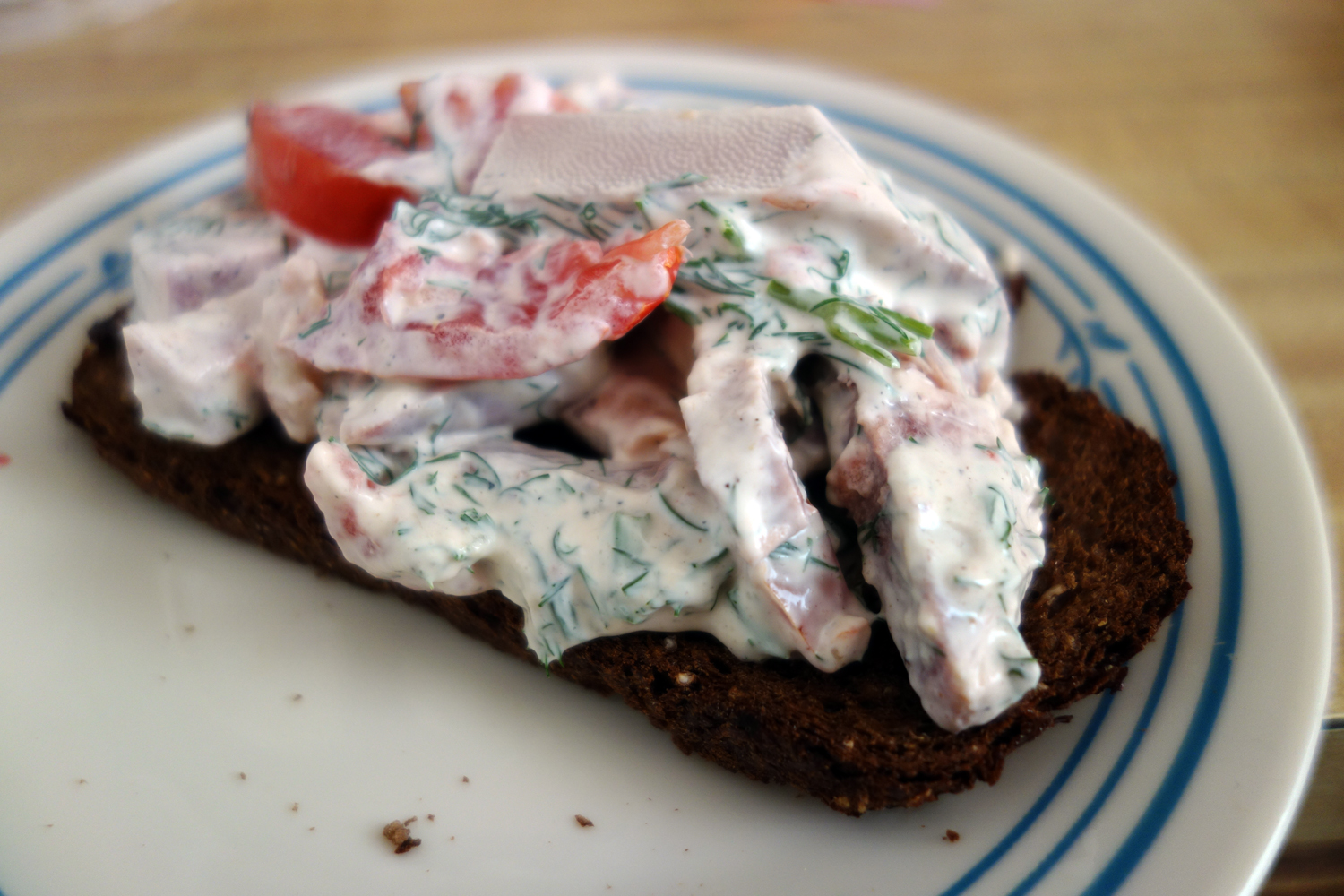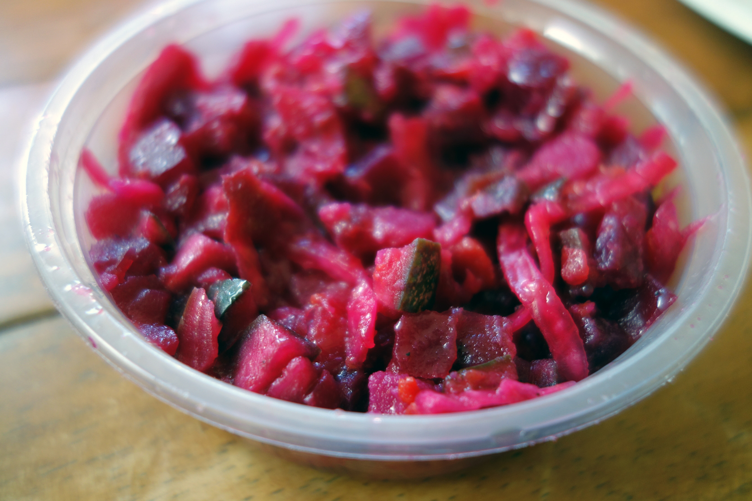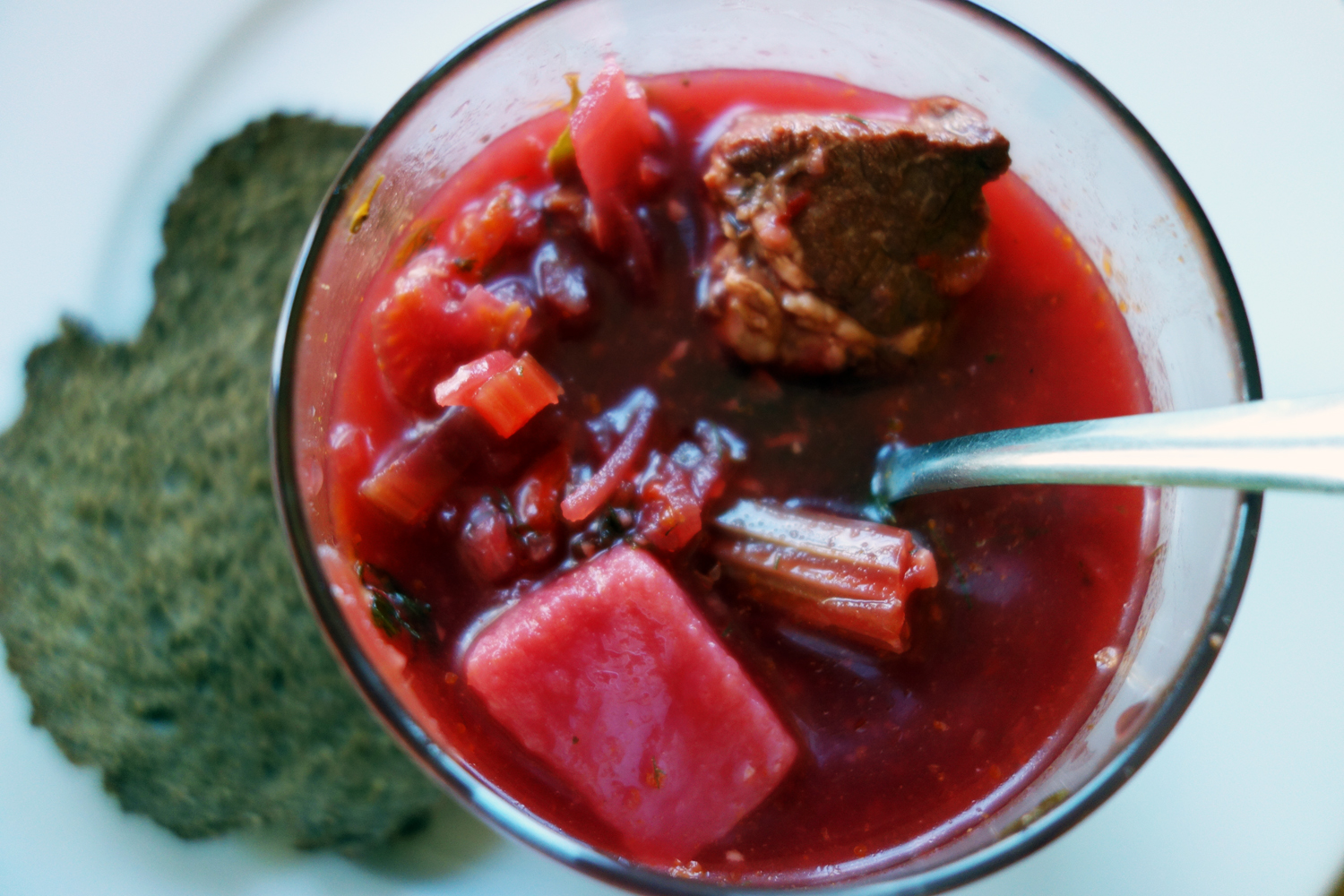 Borscht with Meat (борщ), the one you heat up and (optionally) add sour cream to in this case. It’s a bit like a beet salad drenched in a vibrant, deep pink broth with hearty chunks of chewy beef tossed in, and I love it. The beet-beef broth is not too intense in flavor, but is actually mild and diluted, with that soil-and-root flavor of beets, which I prefer to think of as earthy than dirty, mixing with the savory broth from the beef. Beets taste like the land and when prepared correctly and actually become quite sweet. In the case of borscht, this mineral sweetness is lifted up and perfumed by floral dill and bay leaf. Hearty chunks of potato, and plenty of chopped celery maintain their texture and provide a great teeth-sinking bite to each spoonful, to contrast with the more tender, juicy shreds of beetroot. The chunks of beef are great, fatty, soaking up the flavors of the broth around it. Served with a toasted slice of black rye bread, this stuff is perfection on a cold winter night (or on a hot summer day, if you get the cold meatless version).