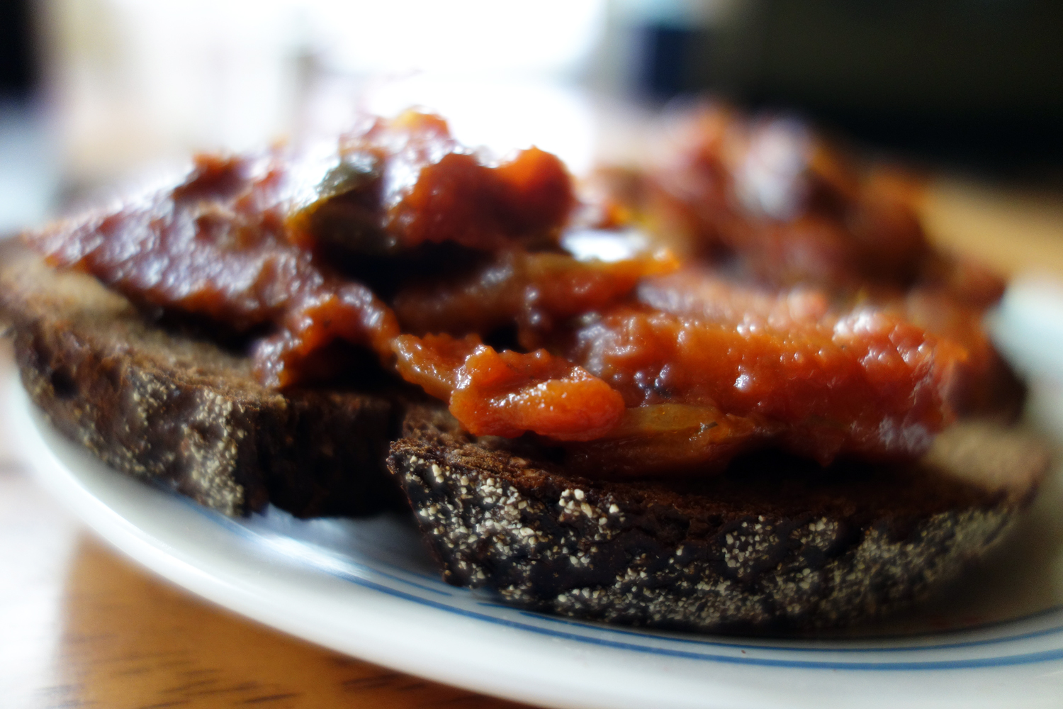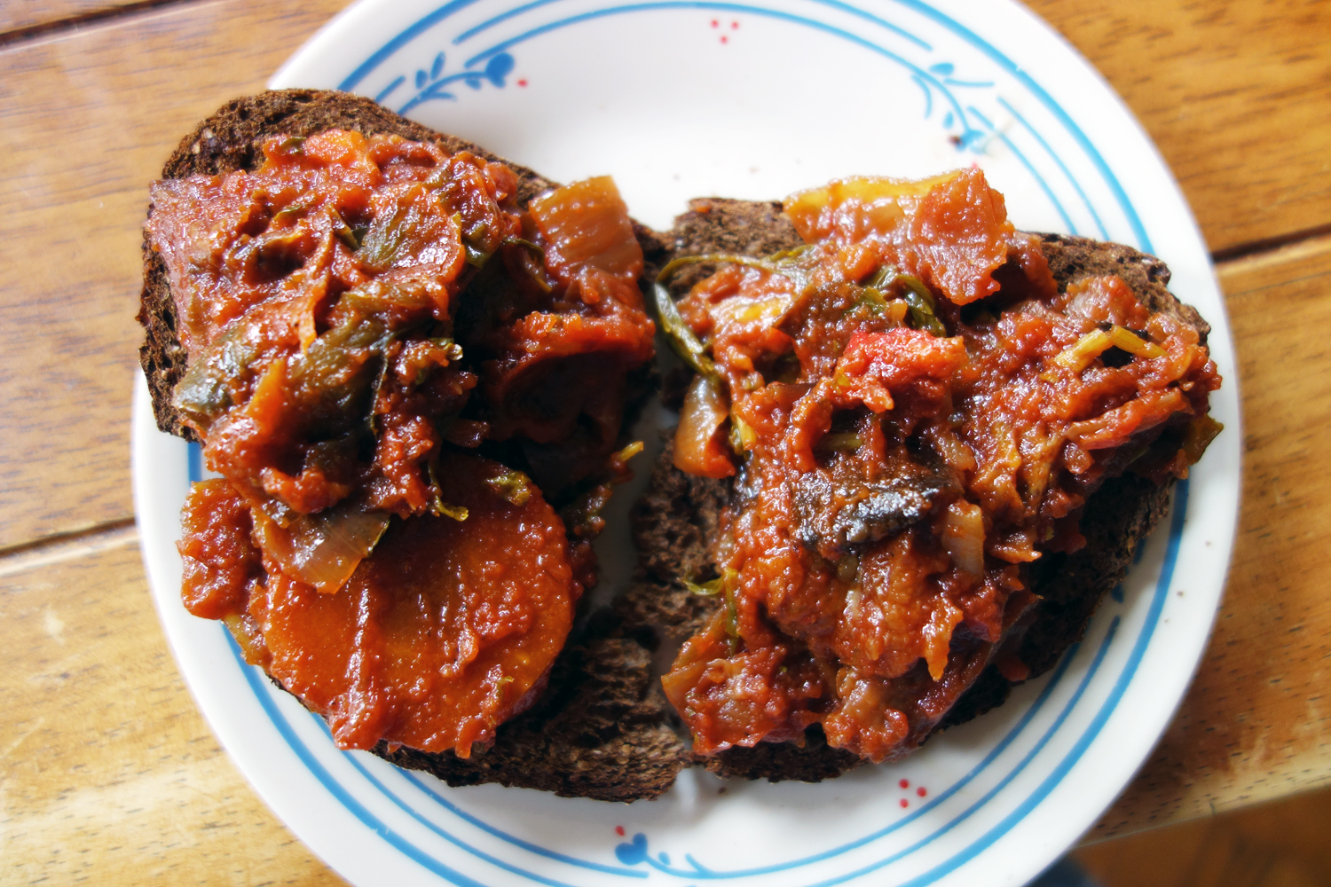 One of those oily veggie toppings that go great with the Russian rye bread is Bazaar’s Baked Eggplant Paste. Not a difficult one to figure out. Eggplant is baked until tender and then pureed until it reaches a nice, mushy consistency. It is combined then with onions and garlic which have been sauteed in a generous amount of oil. Some tomatoes, carrot slices, and, I think, celery are tossed in along with some pepper and sugar to add a bit of sweetness. The thing is then cooked altogether until the flavors of the veggies come together and the spread reaches a nice, “set” consistency. A tad oily, but the rye bread is there to soak up the excess and provide a great base to layer the stuff on thick.
