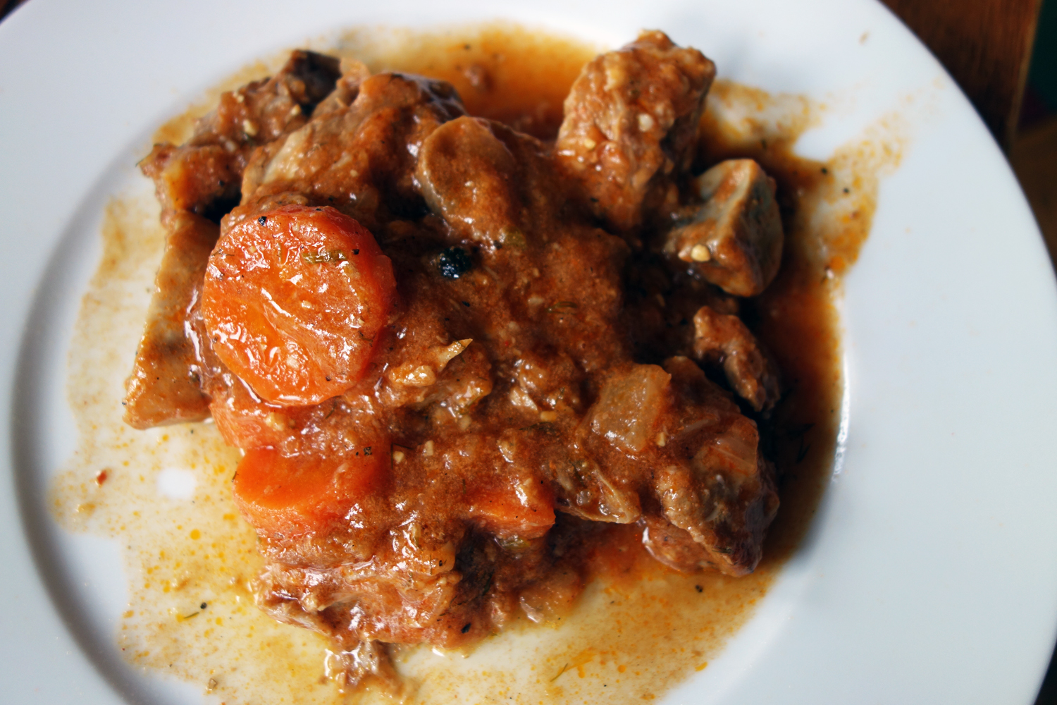 Hungarian Beef Stew. Eh, I guess this one is an okay attempt at goulash, although it is better when made by any woman over 40 in my family. The chunks of beef chuck are tender, fatty and delicious, and the carrots and onions are cooked to a nice soft texture. It is flavored correctly, with plenty of paprika and garlic, and is quite savory. My only qualm is that there are big button mushrooms mixed in there too, an ingredient which would never appear in traditional beef stew in Hungary. Plus, the texture is weird, since it’s a bit too dry to be a stew, let alone a soup. It could have been turned into a Paprikás and ladled onto some nokedli (chewy egg dumplings), but even so there would need to have been more sauce for the side to soak up. Skip this one and visit Hungary if you are looking for real goulash.