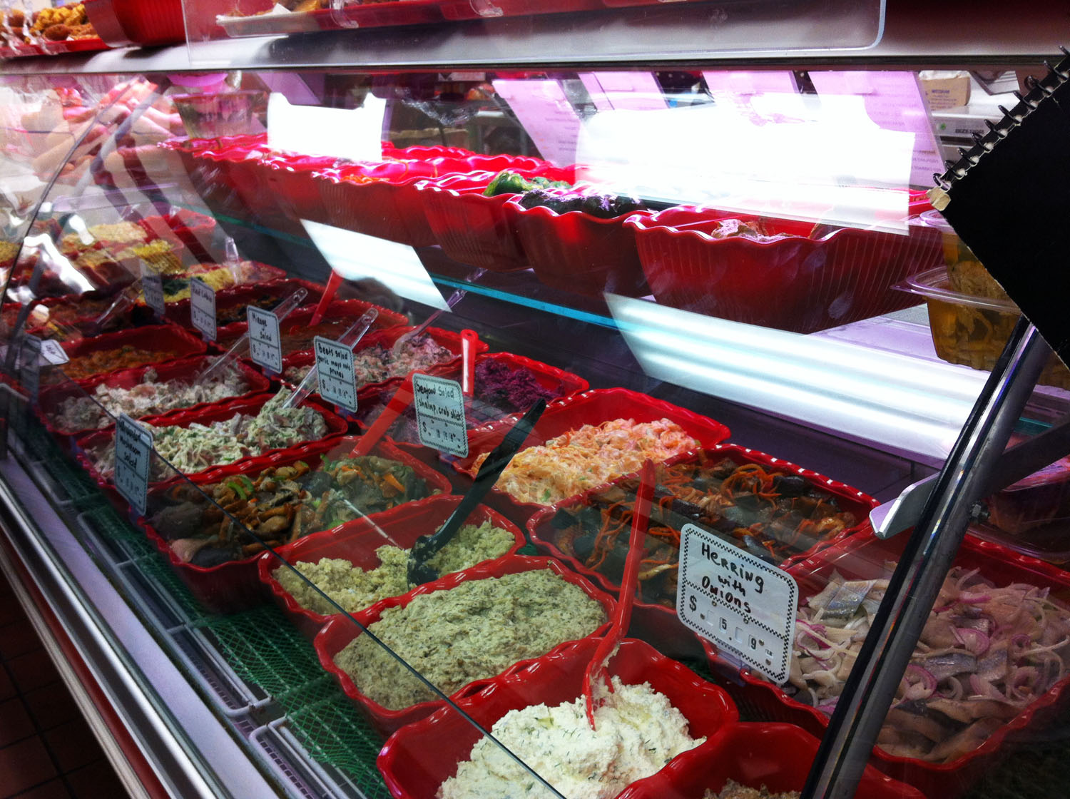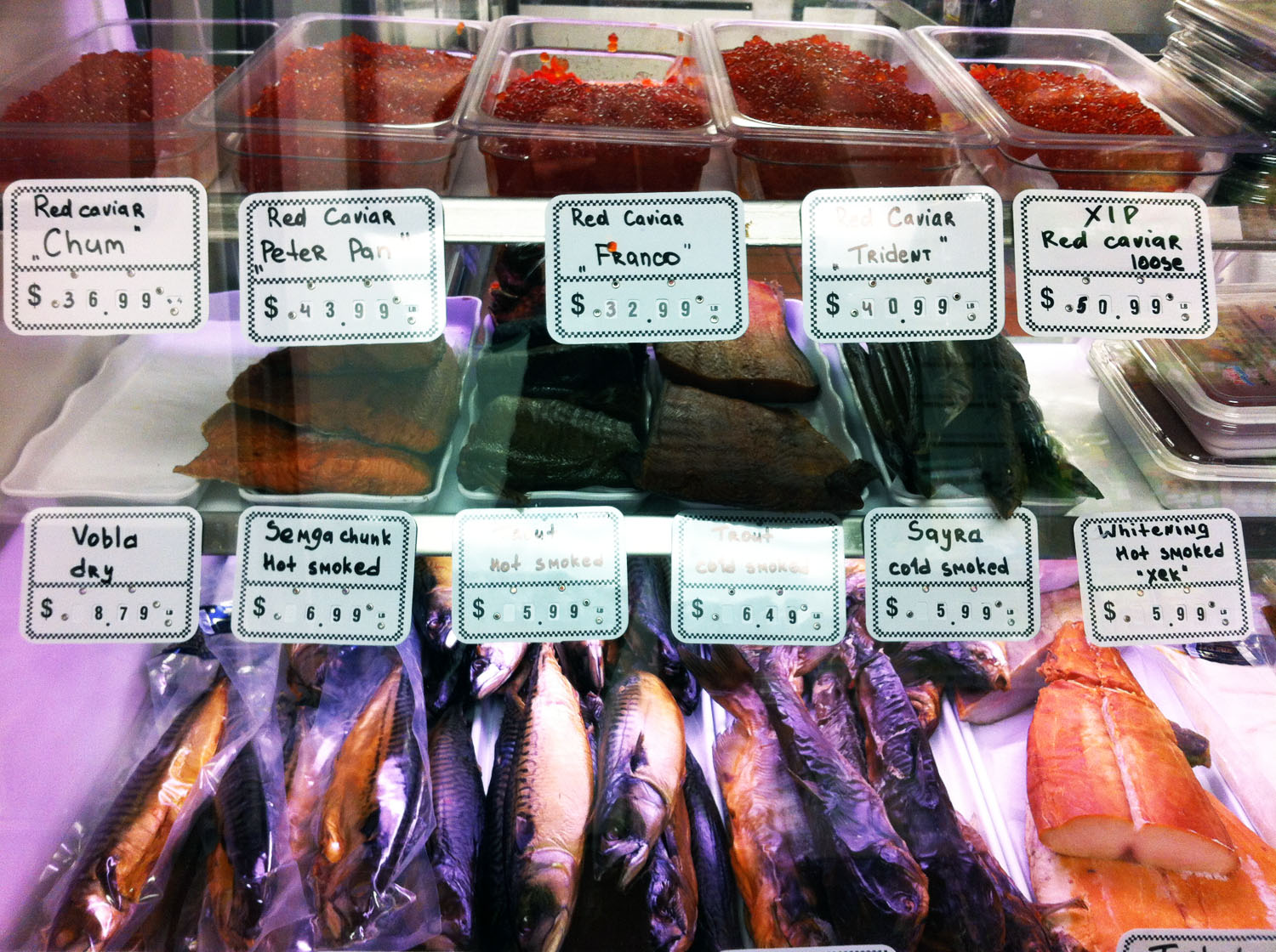 I paid a visit to Bazaar with my dad a few weeks ago and had a great time exploring the wide selection of pre-made salads, sides, meats and stuffed pastries, as well as the huge collection of oily hot and cold smoked whole fish and red caviar they had on display. My dad once told me that in Russia it used to be perfectly socially acceptable to keep a smoked fish in one’s shirt pocket, like a pen, and to take it out every once in a while to chew on it like jerky. I’m not sure I’d take my Russophile ways that far, but everything else in the store gets a green light when it comes to our fridge. Here are some things we got last time.