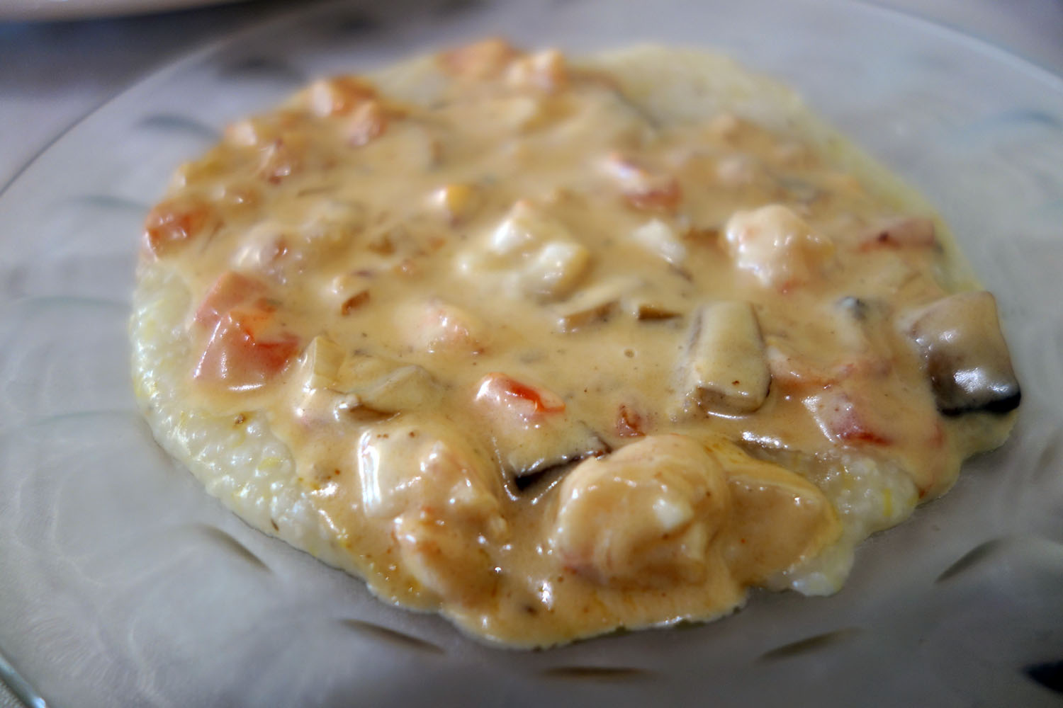 My friend’s uncle explained that Shrimp and Grits is a good representation of the cuisine of the Lowcountry, which includes the South Carolina Lowcountry and the Georgia coast. Apparently this is a regional cuisine that shares some features with Southern cooking but is actually pretty different in many ways. Because of cultural, economic and demographic differences as well as because of easy access to estuary-linked seafood, Lowcountry cuisine seems to have many parelels to New Orleans Cajun cuisine. Shrimp are important here. Hence, throwing them on top of grits with a luxurious French sauce and sherry.