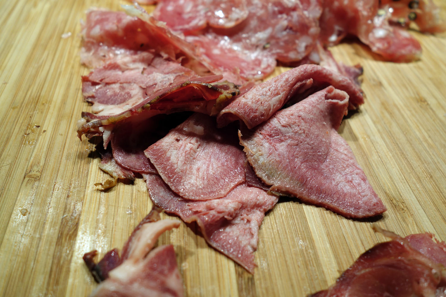 A wooden chopping board appeared with some nicely marbled and very thinly sliced ribbons of salami, punctuated by cross-sections of whole peppercorns, which added some toasty heat to meat that was fresh and light in texture but echoing age in the cure. Next to these, some delightful folds of what I was (and still am) quite certain was leftover tongue, but which the chefs claimed to be penis. I did note that the meat had some pretty well-integrated blotches of fat marbled in here and there which tongue doesn’t normally have too much of. Still, it had that characteristic soft, slightly furry texture and virtually the same flavor as tongue. Although I have tried (and thoroughly enjoy) the creamy, velvety deliciousness of bull testicles, I had never had penis, so I couldn’t have recognized it as such. I do happen to know, however, that bull penis is a bit more like pig’s tail (without the meat) or chicken feet – nothing but sticky skin, fat, some collagen, and bone, maybe some cartilage thrown in there too. These slices were meaty and tender, as well as far too large in cross section to be penis. Hmmmmm….. Although I call b*llsh*t on this one, it did give my friend an incentive for playing a competitive shouting game that was quite popular back in my high school years…