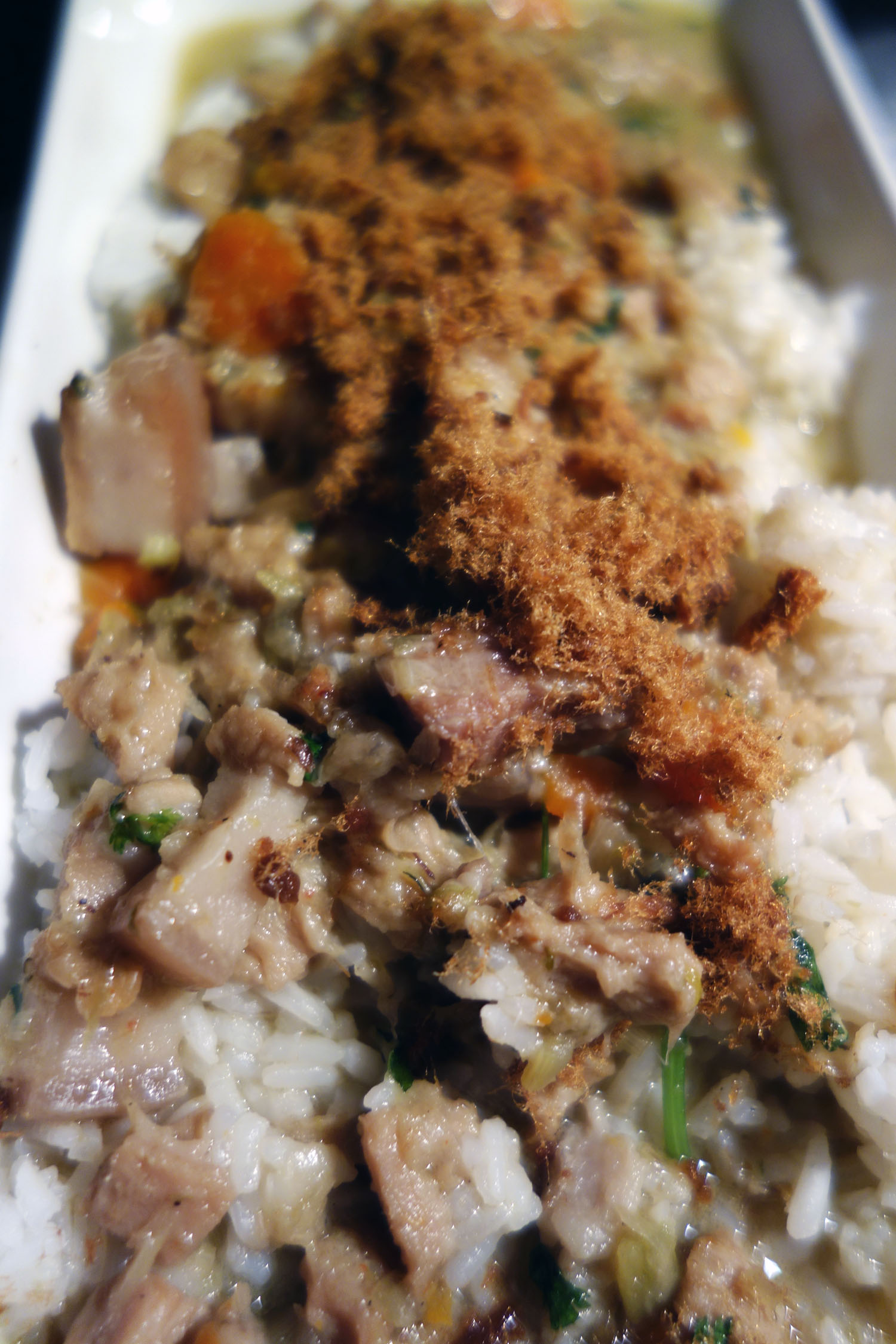 Next, I tried Jamie’s curried stew of tripe, pork belly and, I think, pig’s feet over jasmine rice, topped with pork floss. This was definitely one of my favorites of the night. The tripe was cooked to a point where it was only slightly chewy (pleasant in that each bite brought out more flavor) and the combination of chewy with the fattiness of pork belly made for nice depth and intrigue. The fatty, creamy flavors of the meat were in sharp contrast with the intensely salty and then mildly sweet rousong layered over the top. As always, the meat cotton also added a cool textural element to the dish – dry, chewy, airy, soft. The curry itself, soaked up by the jasmine rice, was great too – light in flavor, with the acidity of lemongrass mixing with coconut milk, which also gave it a creamy complexion.